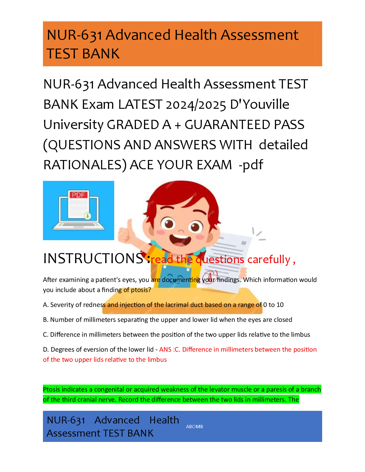 *NURSING > EXAM > NUR-631 Advanced Health Assessment TEST BANK Exam LATEST 2024/2025 D'Youville University GRADED A + GUARANTEED PASS (QUESTIONS AND ANSWERS WITH detailed RATIONALES) ACE YOUR EXAM -pdf