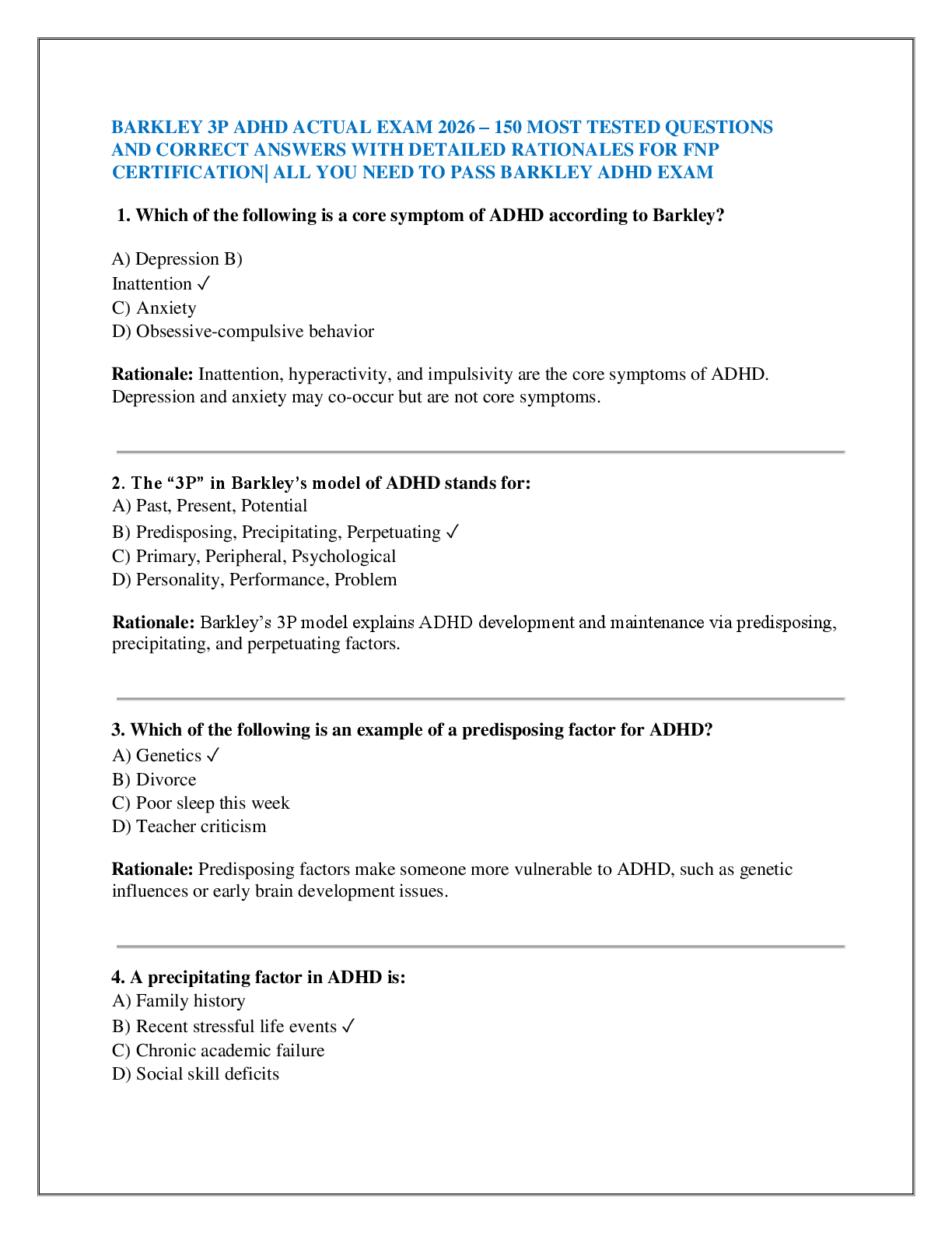 *NURSING > EXAM > BARKLEY 3P ADHD ACTUAL EXAM 2026 – 150 MOST TESTED QUESTIONS AND CORRECT ANSWERS WITH DETAILED RATIONALES FOR FNP CERTIFICATION| ALL YOU NEED TO PASS BARKLEY ADHD EXAM