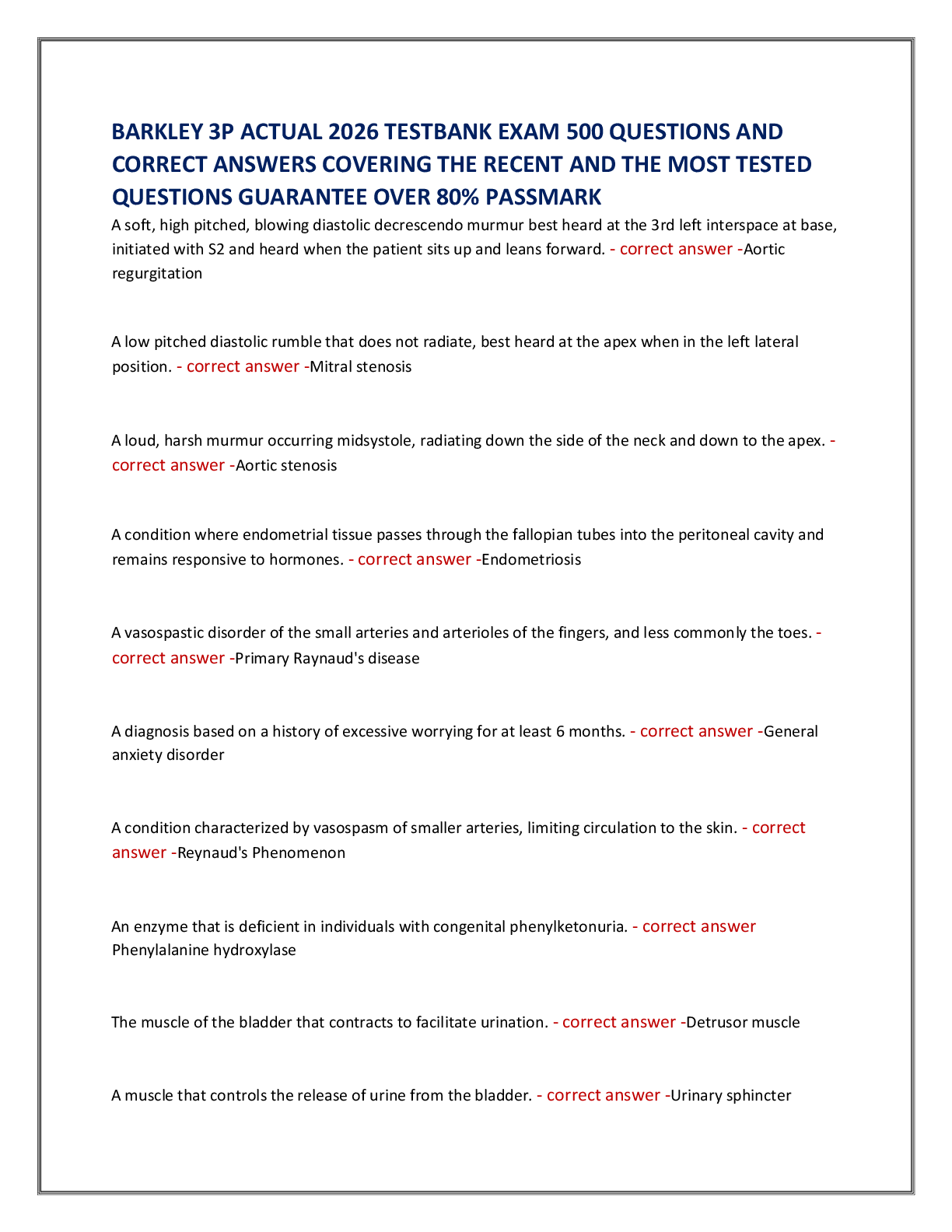 *NURSING > EXAM > BARKLEY 3P ACTUAL 2026 TESTBANK EXAM 500 QUESTIONS AND CORRECT ANSWERS COVERING THE RECENT AND THE MOST TESTED QUESTIONS GUARANTEE OVER 80% PASSMARK