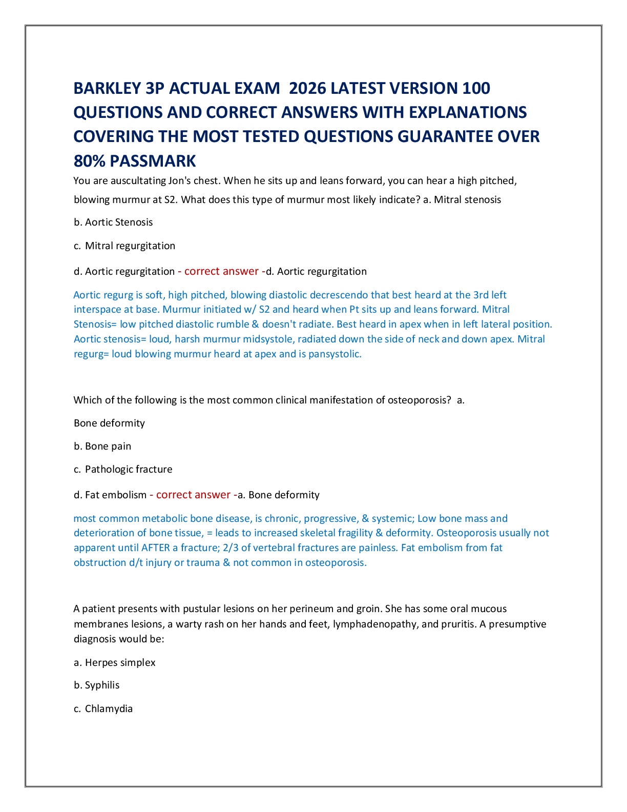 *NURSING > EXAM > BARKLEY 3P ACTUAL EXAM 2026 LATEST VERSION 100 QUESTIONS AND CORRECT ANSWERS WITH EXPLANATIONS COVERING THE MOST TESTED QUESTIONS GUARANTEE OVER 80% PASSMARK