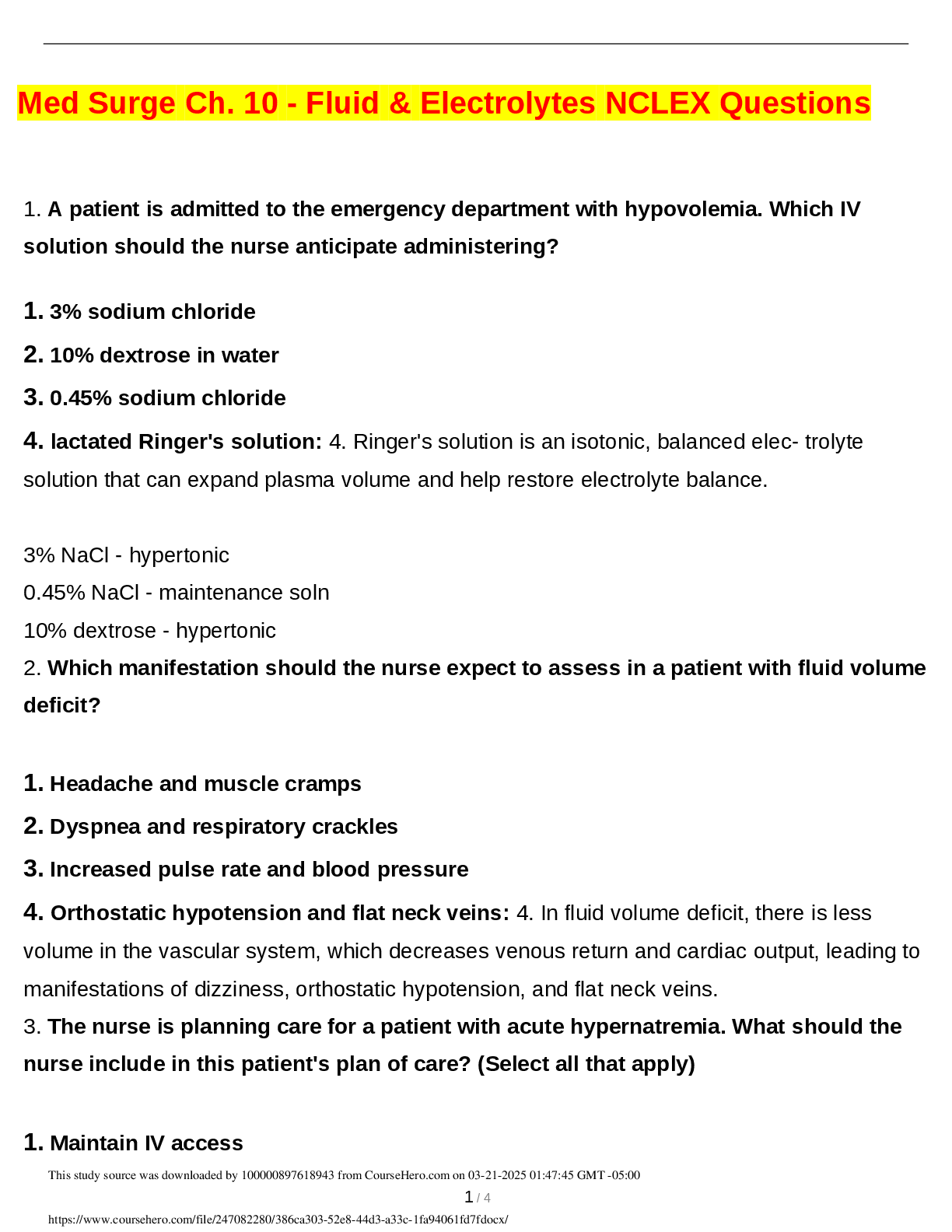 *NURSING > EXAM > Med Surge Ch. 10 - Fluid & Electrolytes NCLEX Questions