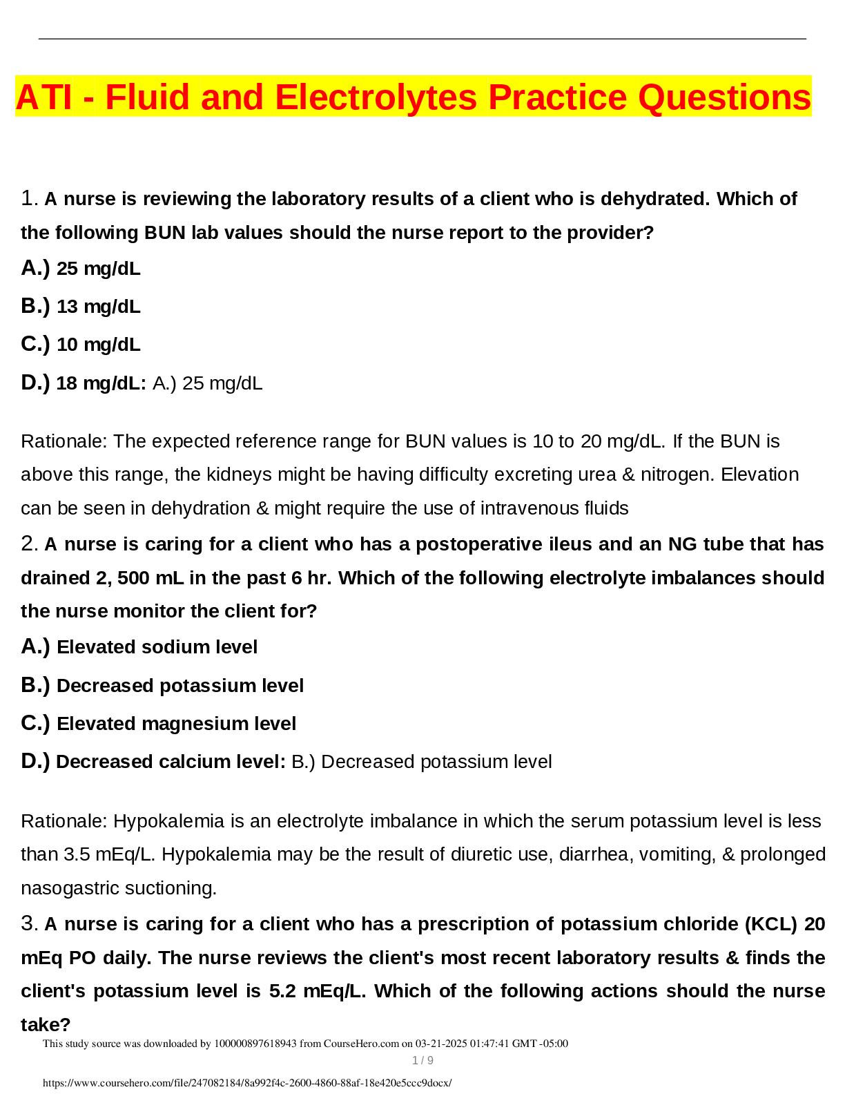*NURSING > EXAM > ATI - Fluid and Electrolytes Practice Questions
