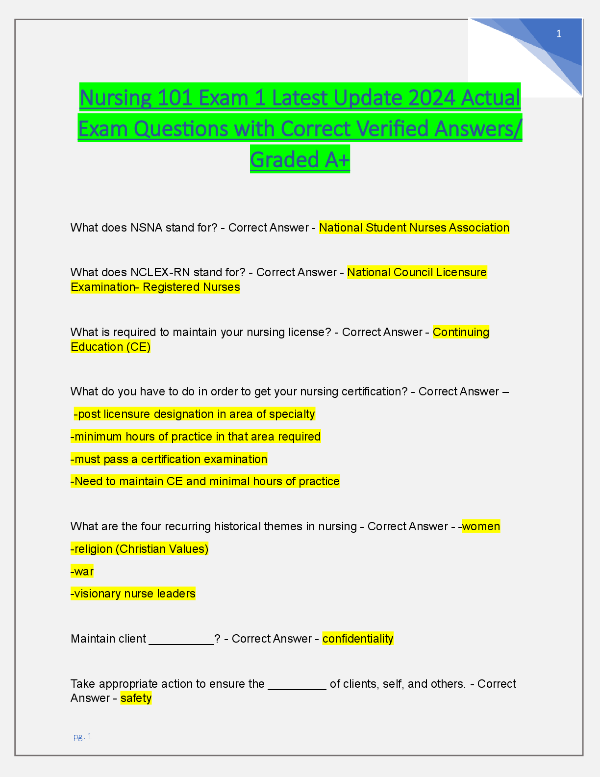 *NURSING > EXAM/TEST TEMPLATE > Nursing 101 Exam 1 Latest Update 2024 Actual Exam Questions with Correct Verified Answers.pdf (4)