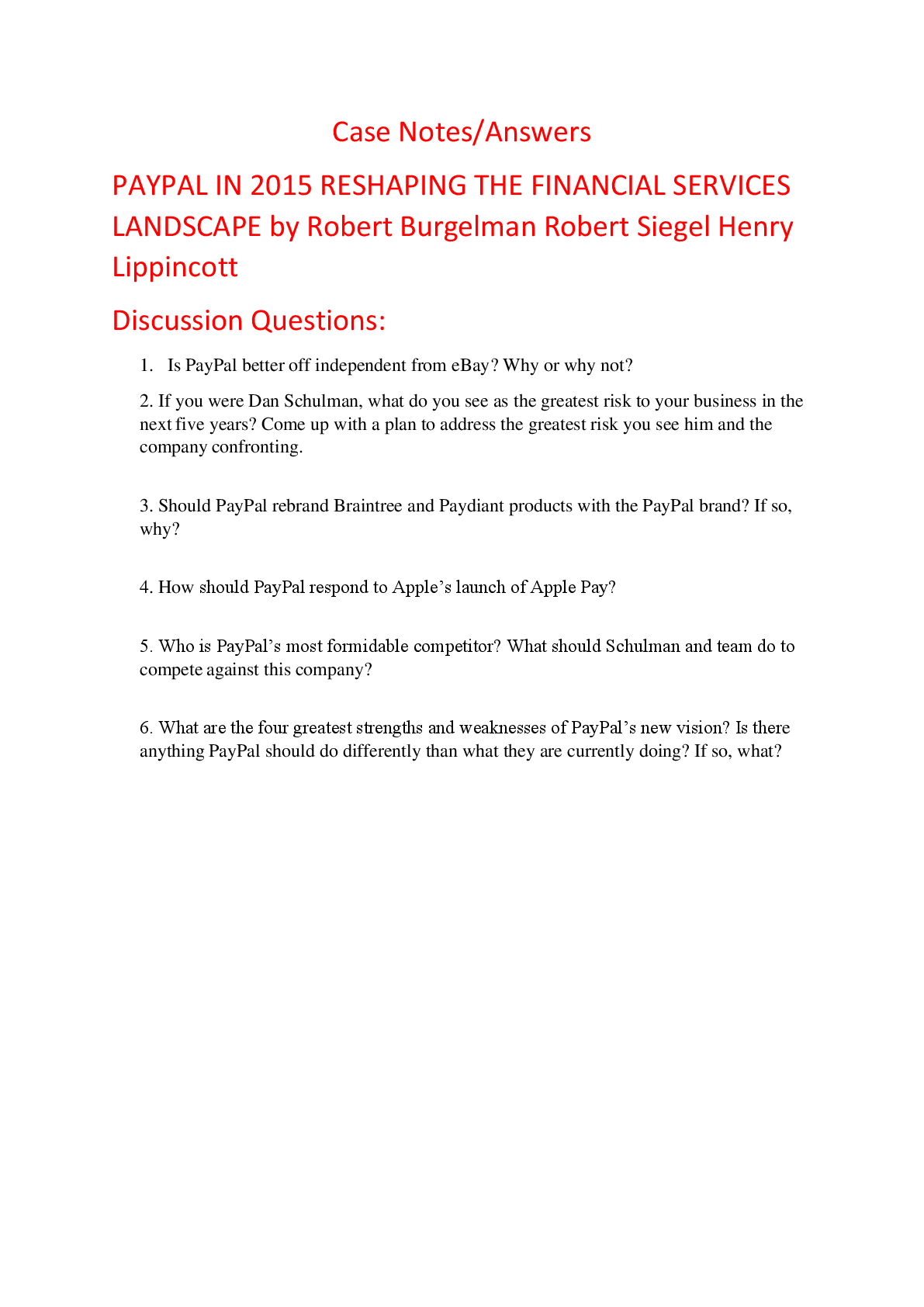 Education > HARVARD CASE SOLUTIONS > Case Notes Answers for PAYPAL IN 2015 RESHAPING THE FINANCIAL SERVICES LANDSCAPE by Robert Burgelman Robert Siegel Henry Lippincott