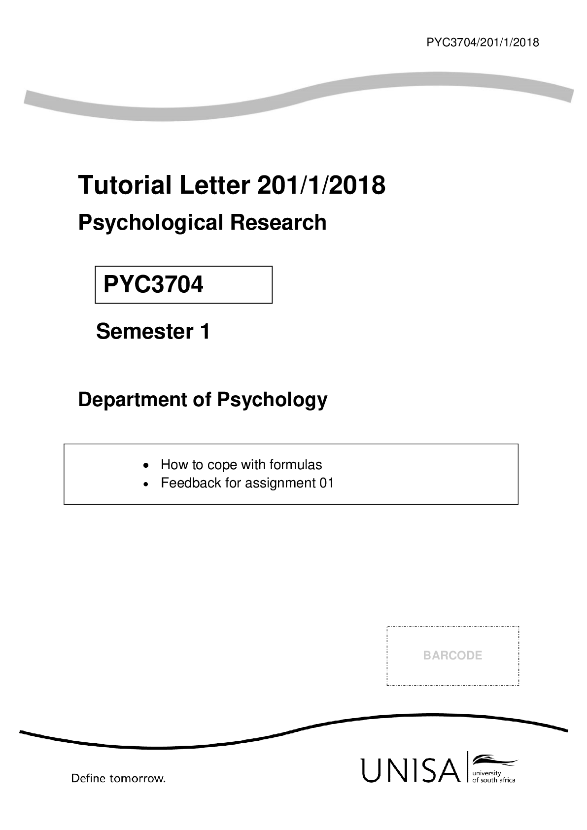 Psychology > STUDY GUIDE > Tutorial Letter 201/1/2018 Psychological Research PYC3704 Semester 1 Department of Psychology