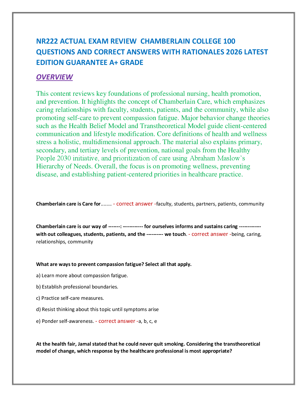 *NURSING > EXAM REVIEW > NR222 ACTUAL EXAM REVIEW CHAMBERLAIN COLLEGE 100 QUESTIONS AND CORRECT ANSWERS WITH RATIONALES 2026 LATEST EDITION GUARANTEE A+ GRADE