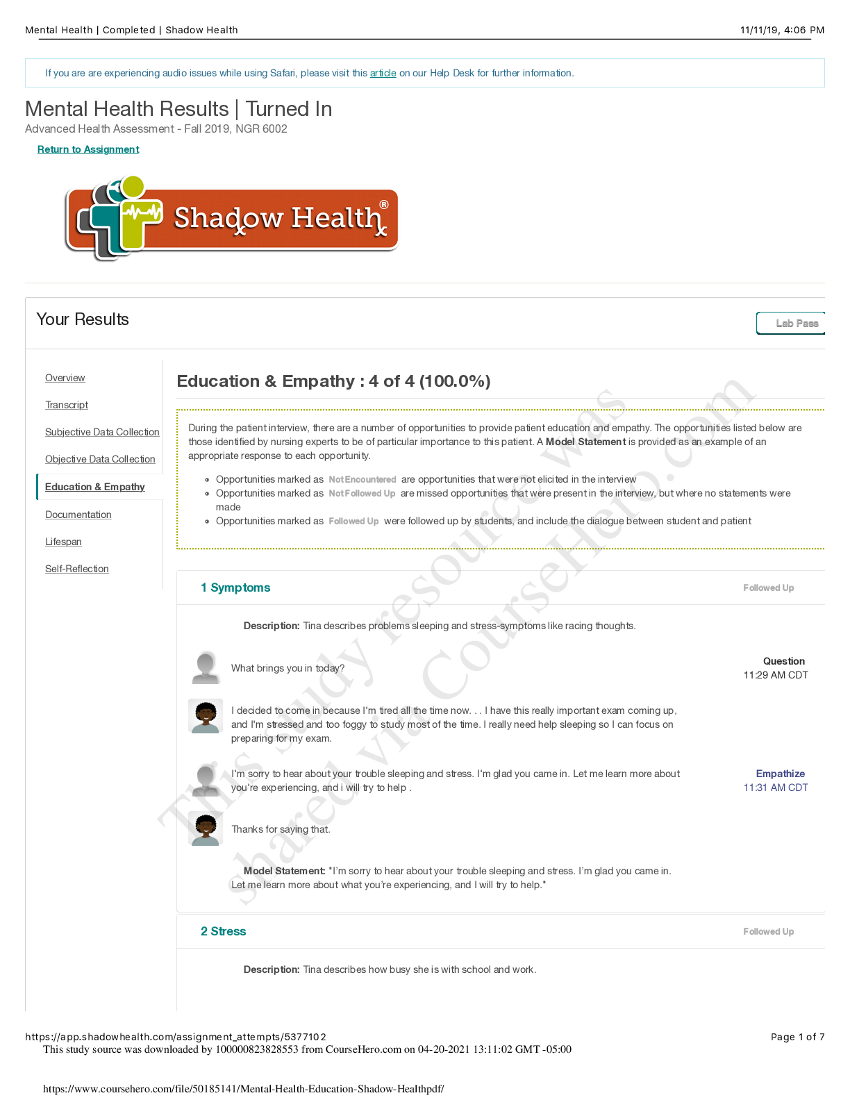 *NURSING > SHADOW HEALTH > NURSING HEALTH ASS Mental Health Subjective data Shadow Health complete solutions with verified updates