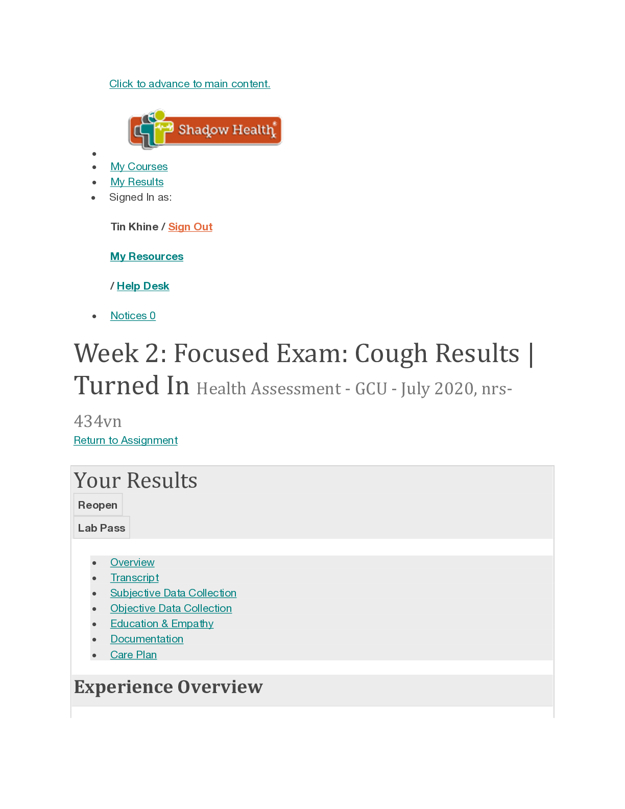 *NURSING > SHADOW HEALTH > Focused Exam Cough | Completed | Shadow Health | 2022 | 141 PAGES