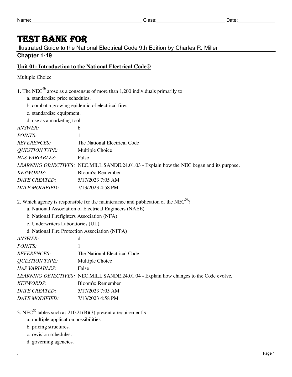 Electrical Engineering > TEST BANKS > SOLUTIONS MANUAL AND ANSWER GUIDE TO THE NATIONAL ELECTRICAL CODE 9TH EDITION BY CHARLES R. MILLER CHAPTER 1- 19 FULL MANUAL WITH VERIFIED SOLUTIONS