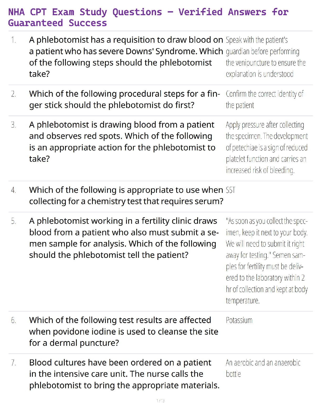 NHA phlebotomy > QUESTIONS and ANSWERS > NHA CPT Exam Study Questions – Verified Answers for Guaranteed Success