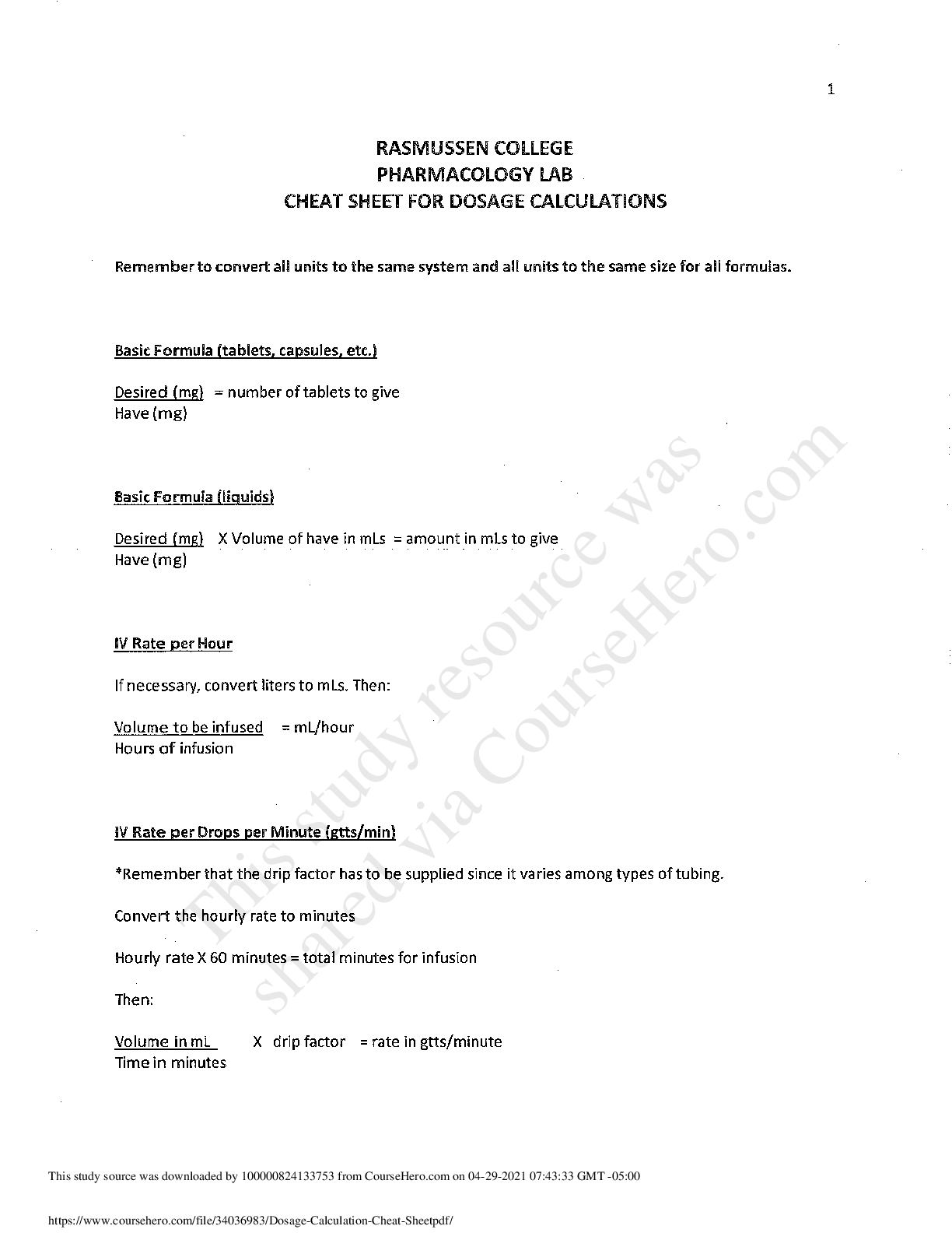 *NURSING > QUESTIONS and ANSWERS > NUR 2407 Pharmacology-Rasmussen College-Dosage Calculation Cheat(2020) Sheet.pdf
