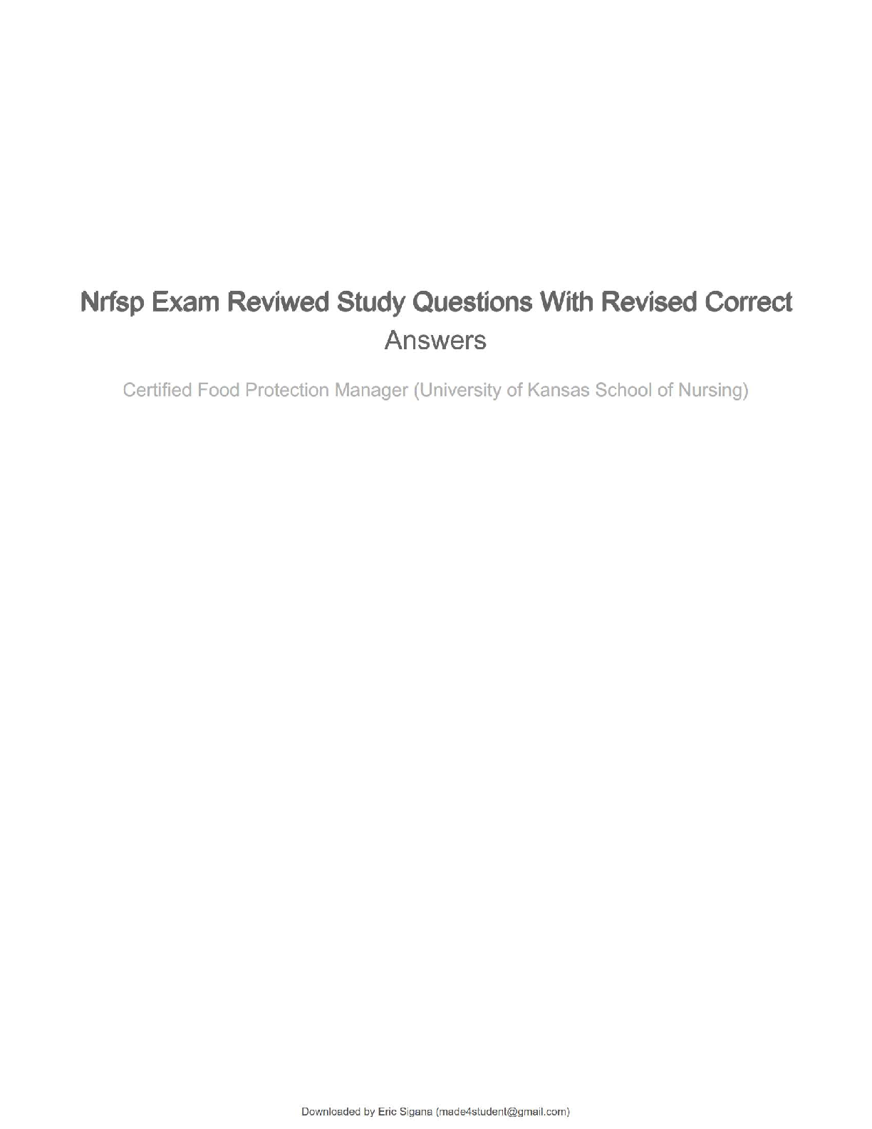 *NURSING > QUESTIONS and ANSWERS > NRFSP – Certified Food Protection Manager Exam | Reviewed Study Questions with Revised Correct Answers (University of Kansas School of Nursing) | Complete Study Guide | 100% Accurate | Grade A