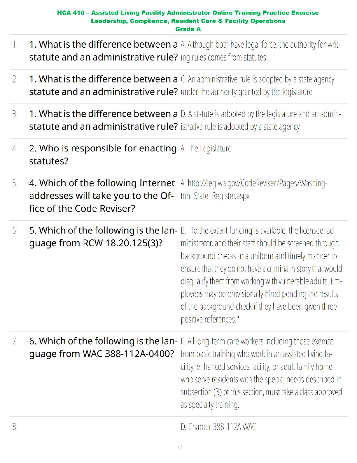 *NURSING > QUESTIONS and ANSWERS > HCA 410 – Assisted Living Facility Administrator Online Training Practice Exercise Leadership, Compliance, Resident Care & Facility Operations Grade A