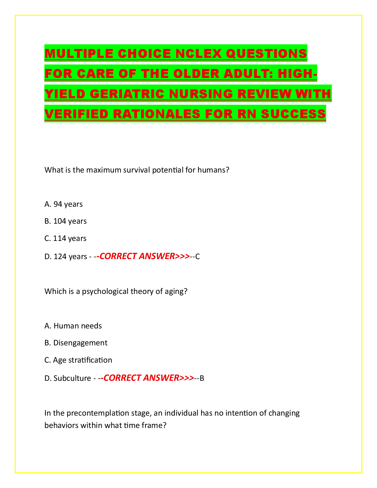 *NURSING > NCLEX > MULTIPLE CHOICE NCLEX QUESTIONS FOR CARE OF THE OLDER ADULT: HIGH YIELD GERIATRIC NURSING REVIEW WITH VERIFIED RATIONALES FOR RN SUCCESS