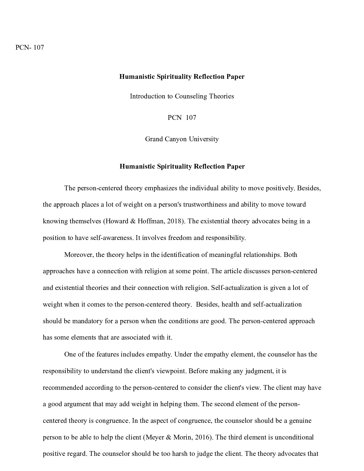Business > CASE STUDY > Reflection.docx(1) PCN- 107 Humanistic Spirituality Reflection Paper Introduction to