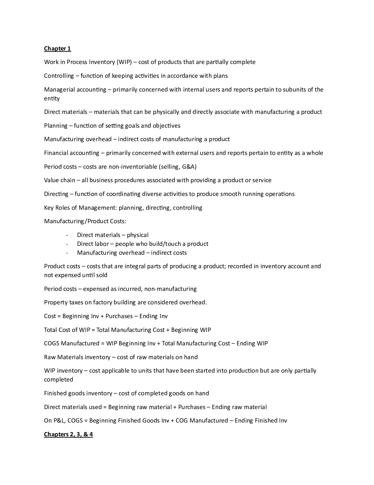 Business > CASE STUDY > Managerial Accounting Notes.docx Chapter 1 Work in Process Inventory (WIP) – cost of p