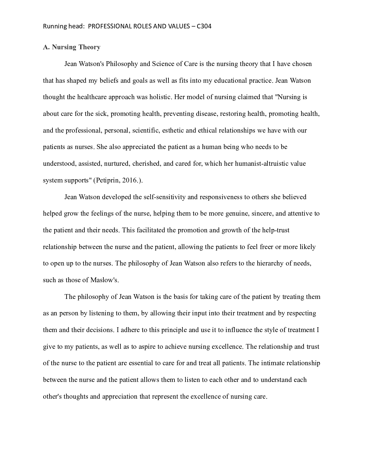 Business > CASE STUDY > Professional Roles Task 1.docx A. Nursing Theory Jean Watson's Philosophy and Science o
