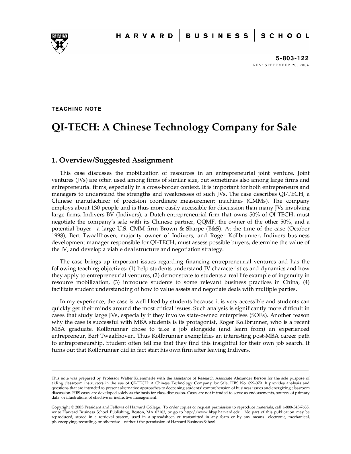 Business > CASE STUDY > QI-TECH A Chinese Technology Company for Sale, By Walter Kuemmerle, Chad Ellis (Case Notes Answer with Free Case File)