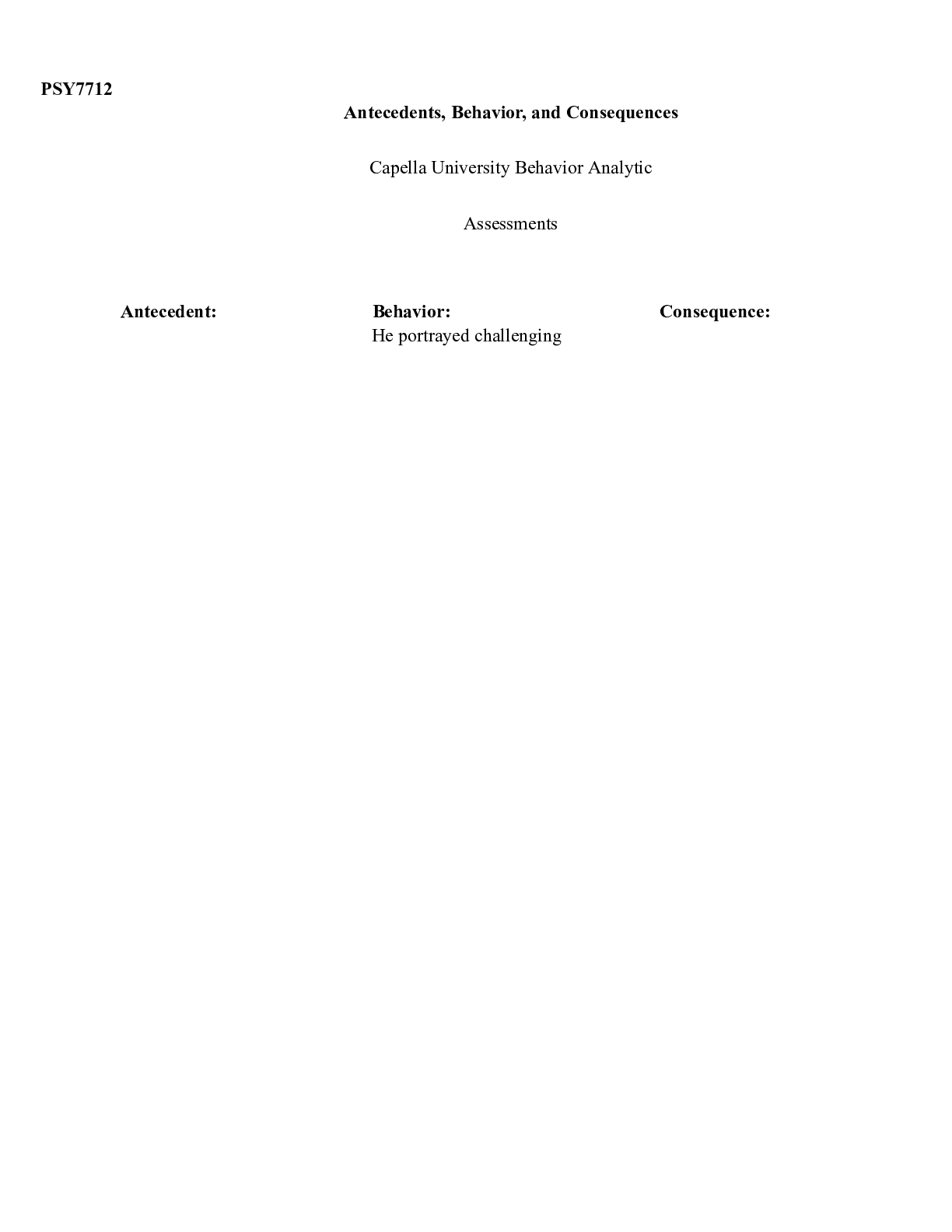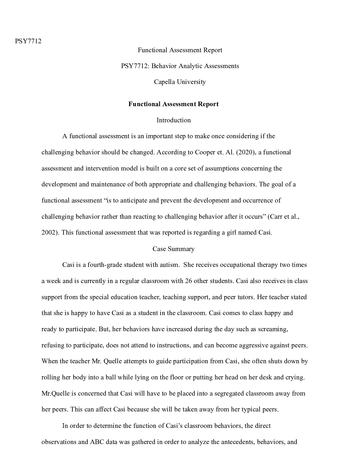 Business > CASE STUDY > U07A01.docx PSY7712 Functional Assessment Report PSY7712: Behavior Analytic Assessments