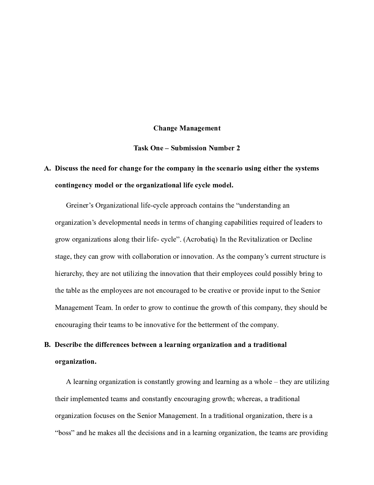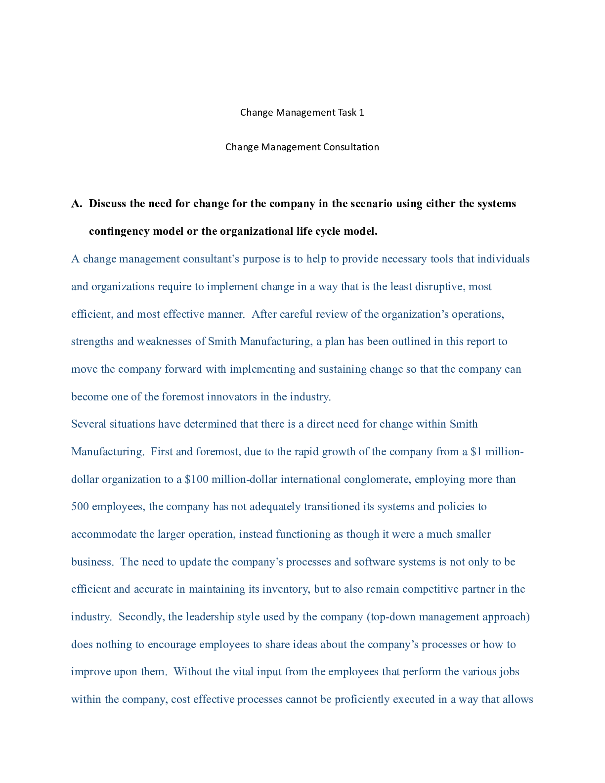 Business > CASE STUDY > Discuss the need for change for the company in the scenario using either the Change Man