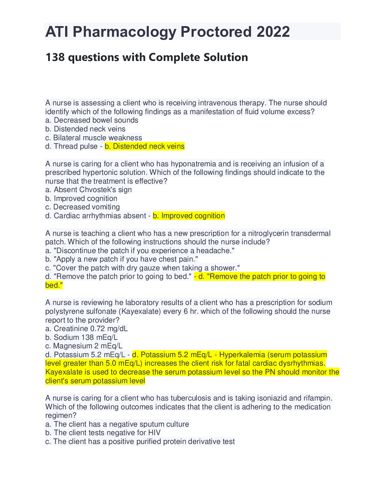 Health Care > Other Study Resources. > ATI Pharmacology Proctored 2022 138 questions with Complete Solution