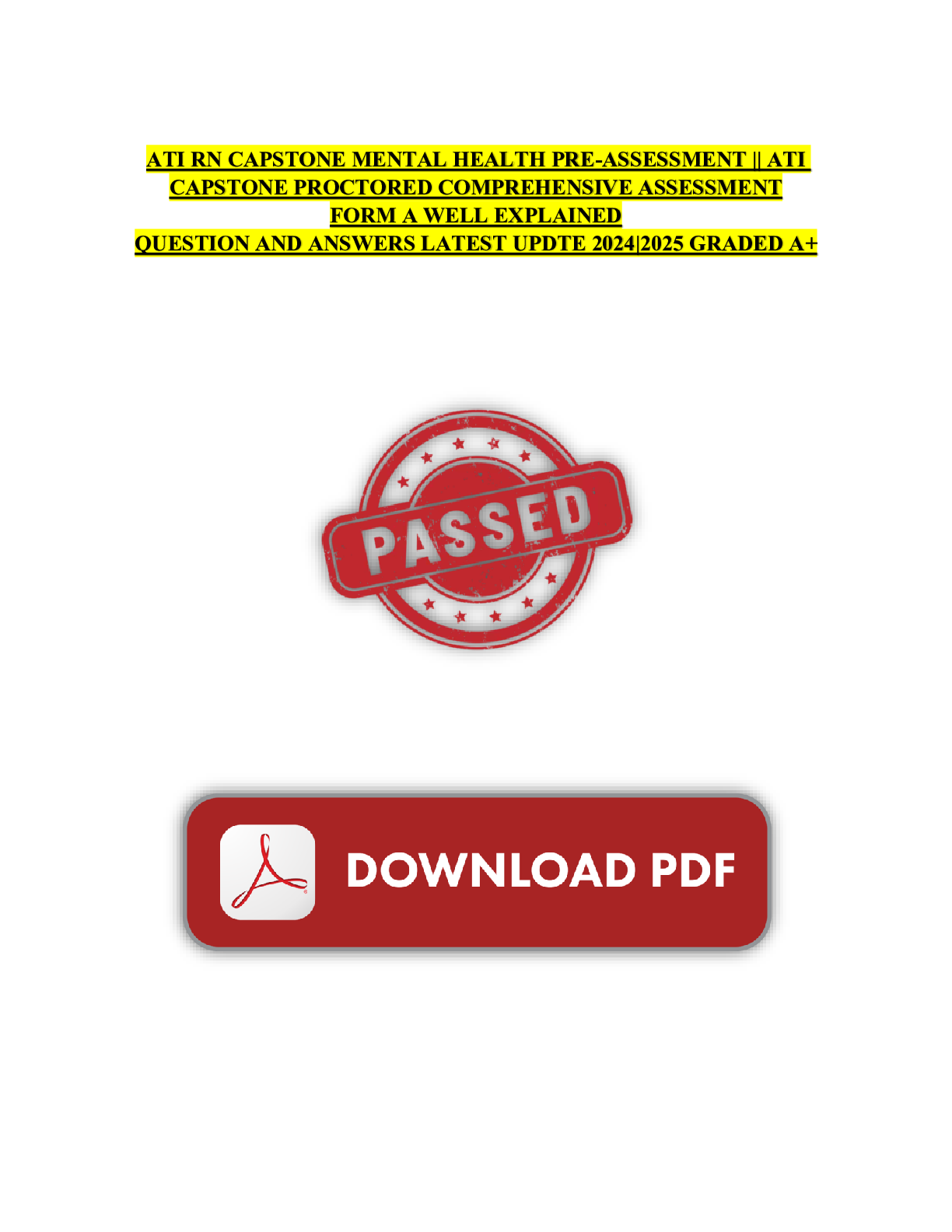 *NURSING > Other Study Resources. > ATI RN CAPSTONE MENTAL HEALTH PRE-ASSESSMENT || ATI CAPSTONE PROCTORED COMPREHENSIVE ASSESSMENT FORM A WELL EXPLAINED QUESTION AND ANSWERS LATEST UPDTE 2024|2025 GRADED A+