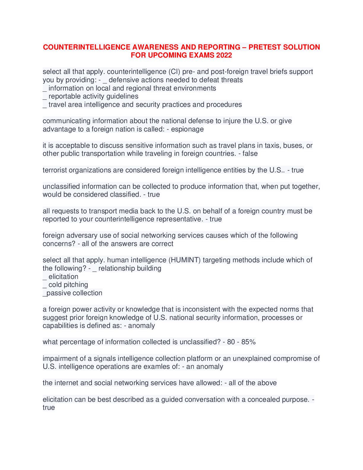 *NURSING > Quiz > COUNTERINTELLIGENCE AWARENESS AND REPORTING – PRETEST SOLUTION FOR UPCOMING EXAMS 2022
