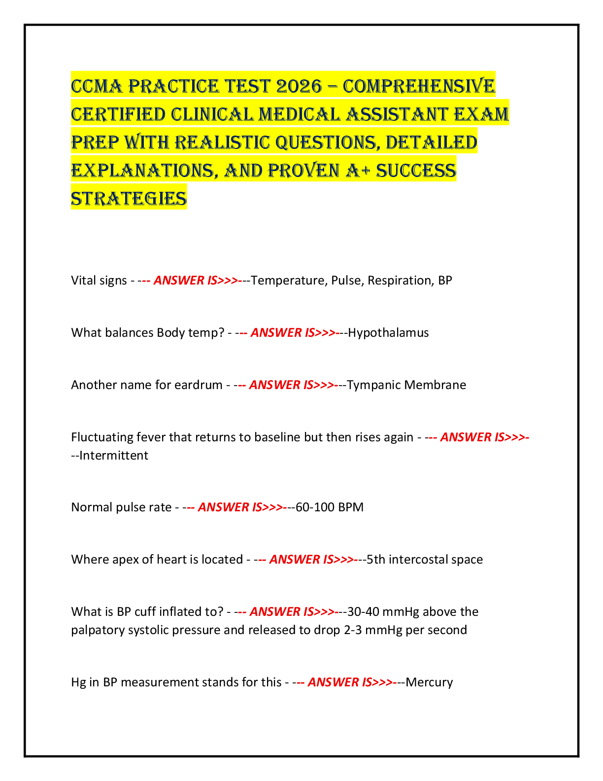 *NURSING > EXAM > CCMA PRACTICE TEST 2026 – COMPREHENSIVE CERTIFIED CLINICAL MEDICAL ASSISTANT EXAM PREP WITH REALISTIC QUESTIONS, DETAILED EXPLANATIONS, AND PROVEN A+ SUCCESS STRATEGIES