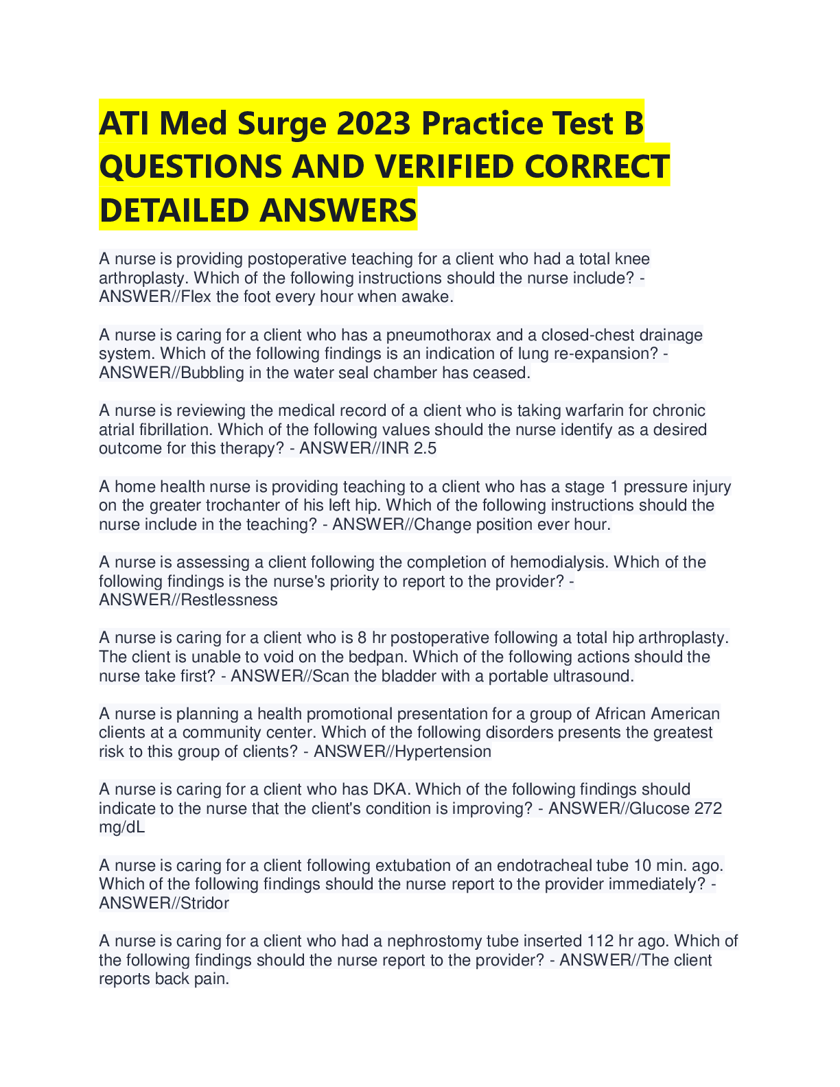 ATI RN MED SURG PROCTORED EXAM 2023 LATEST EXAM > A-Level Question Paper > ATI Med Surg 2023 Practice Test B: 100+ Questions & Verified Detailed Answers | Nursing Study Guide