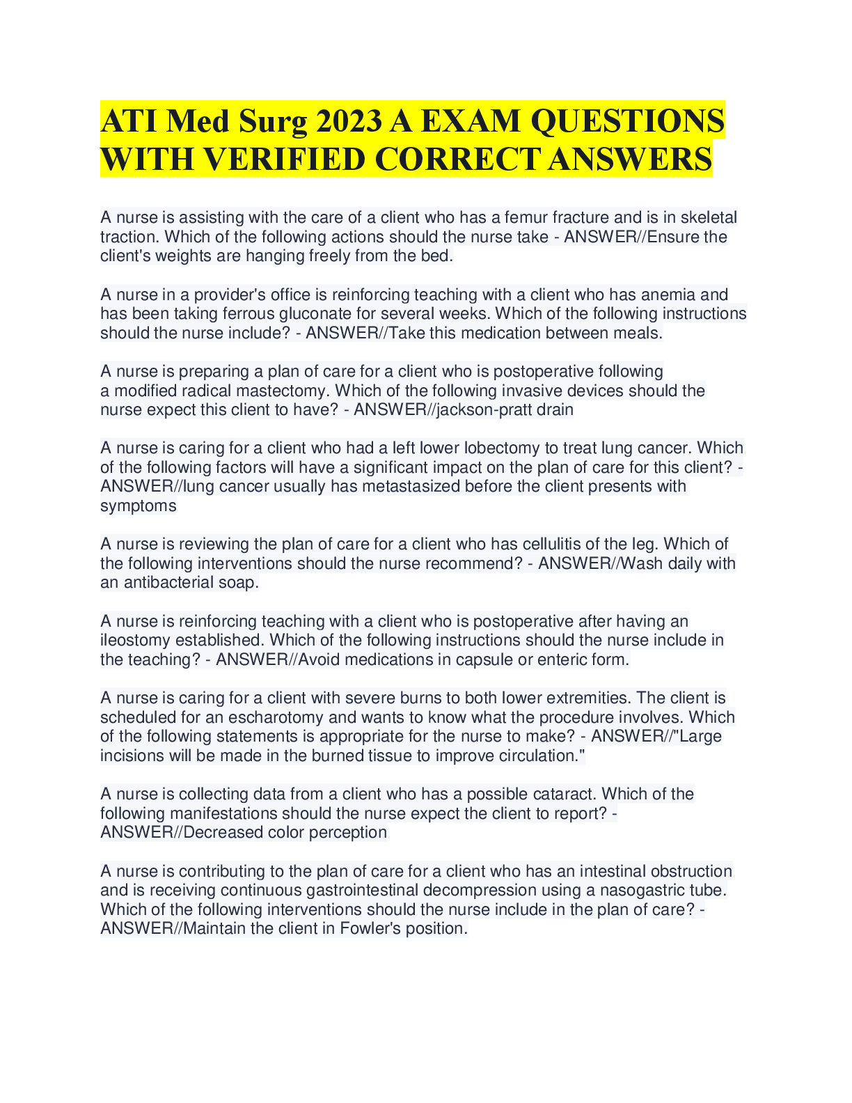 ATI RN MED SURG PROCTORED EXAM 2023 LATEST EXAM > A-Level Question Paper > ATI Med Surg 2023 A Exam: 350+ Questions & Verified Correct Answers | Nursing Study Guide