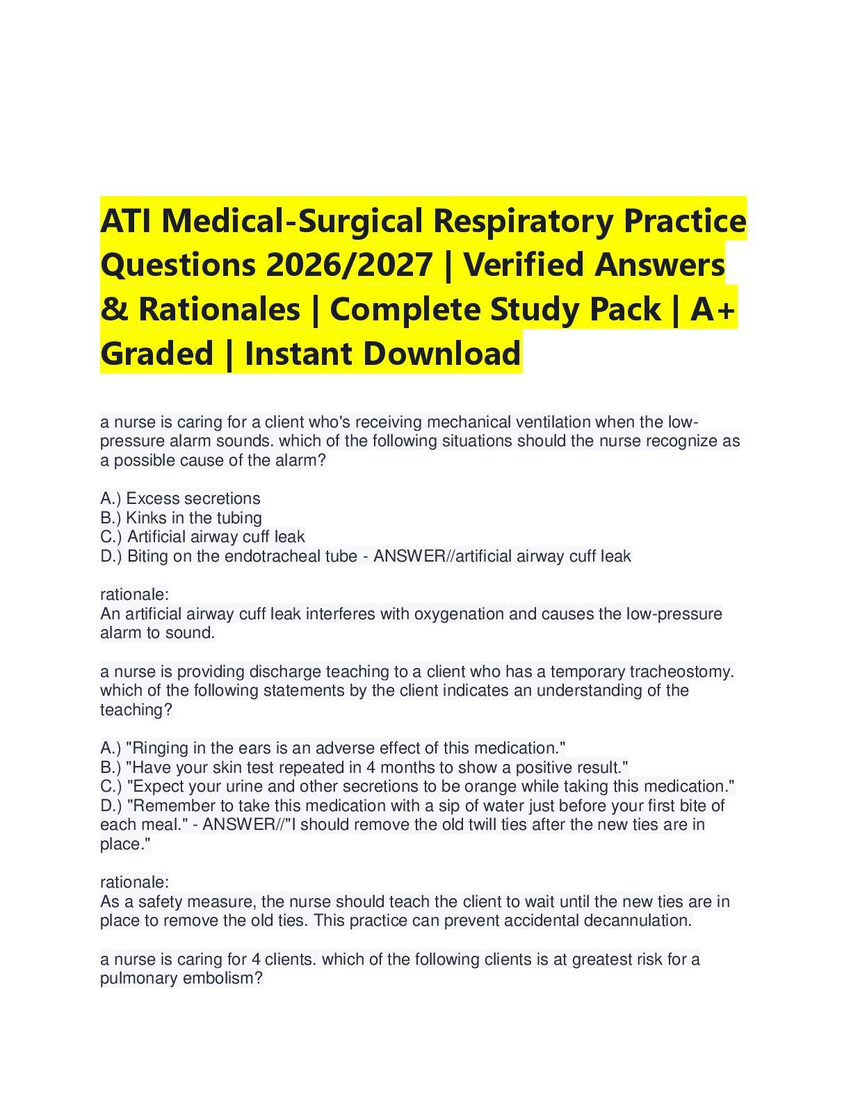ATI Med Surg > A-Level Question Paper > ATI Med-Surg Respiratory Practice Questions 2026/2027: 30+ Verified Answers & Rationales | NCLEX Study Guide