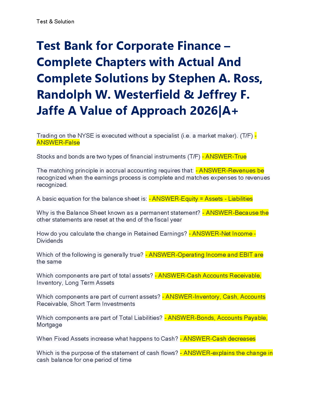 Finance > TEST BANKS > Test Bank for Corporate Finance – Complete Chapters with Actual And Complete Solutions by Stephen A. Ross, Randolph W. Westerfield & Jeffrey F. Jaffe A Value of Approach 2026|A+