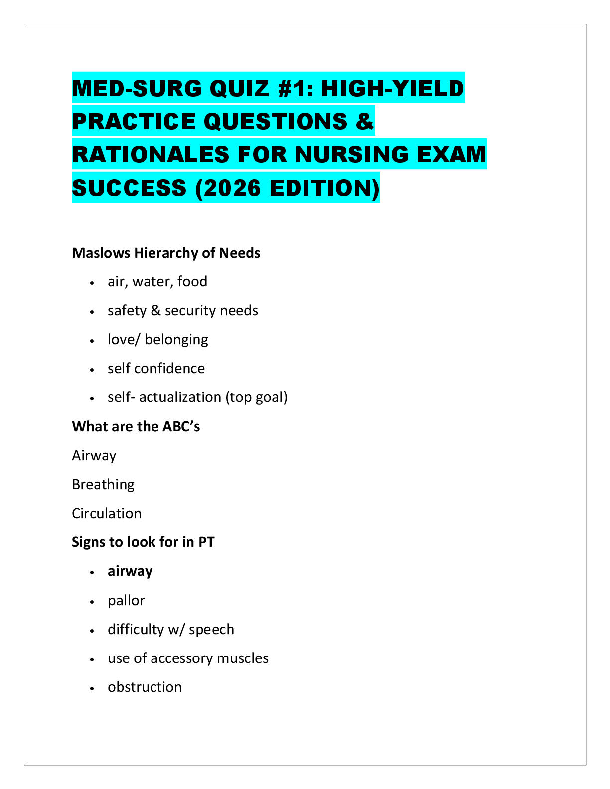 *NURSING > Quiz > MED-SURG QUIZ #1: HIGH-YIELD PRACTICE QUESTIONS & RATIONALES FOR NURSING EXAM SUCCESS (2026 EDITION)