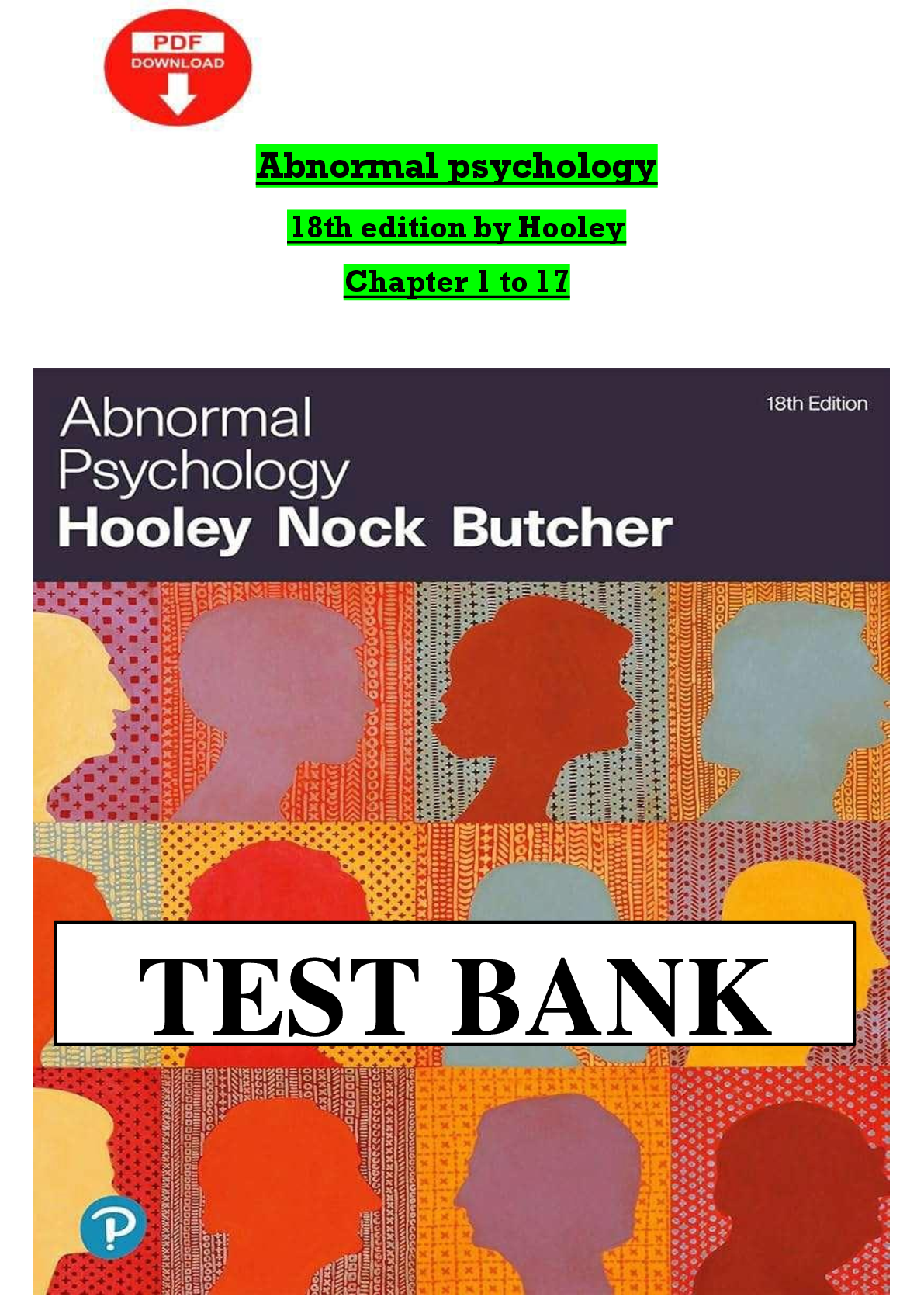Psychology > TEST BANKS > Test Bank for Abnormal Psychology, 18th Edition by Jill M. Hooley, Matthew K. Nock & James N. Butcher | ISBN: 9781292364568 | Complete Verified Chapters 1-17 | MCQs with Answers | Downloadable PDF