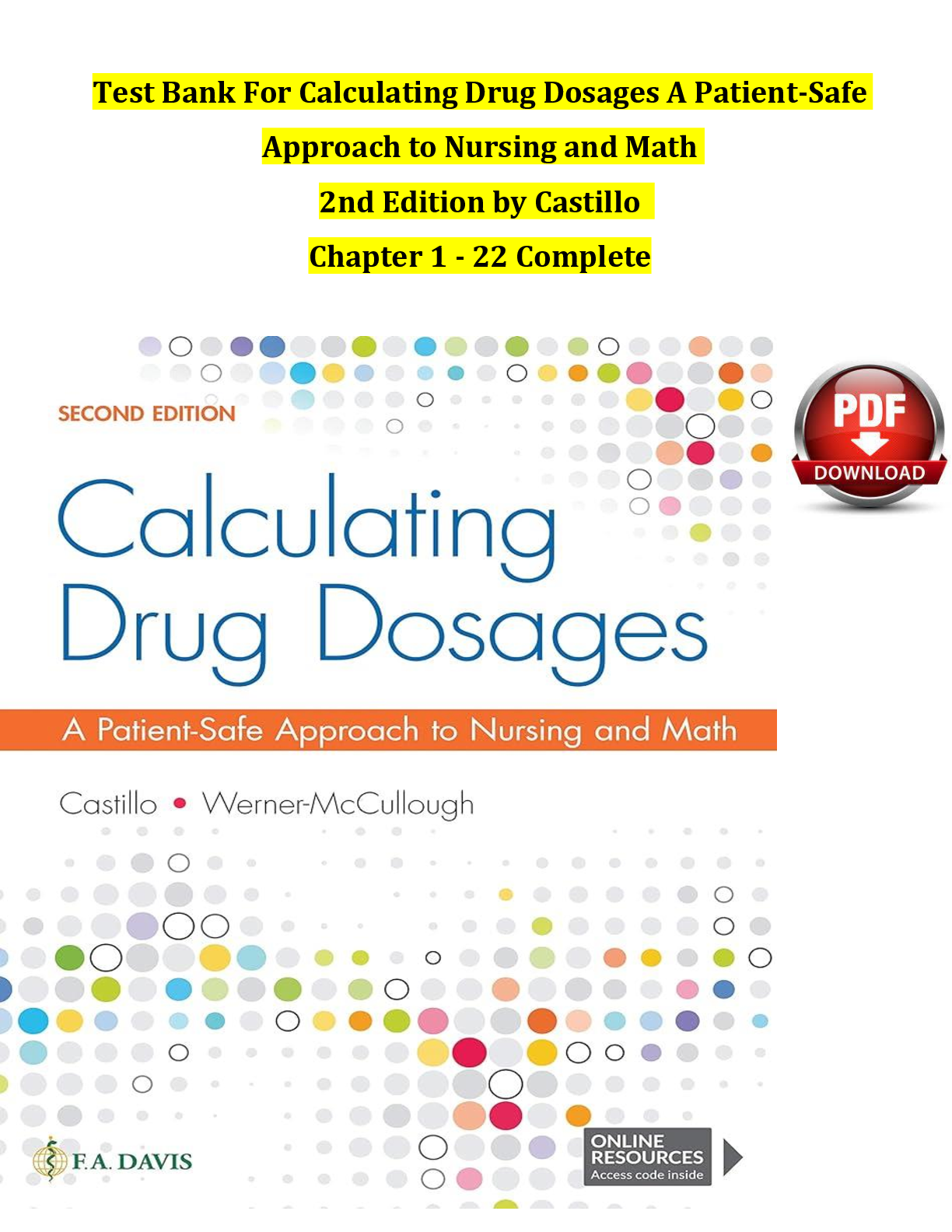 Dosage Calculations for Nursing Students > TEST BANKS > Test Bank for Calculating Drug Dosages: A Patient-Safe Approach to Nursing and Math, 2nd Edition by Castillo & Werner-McCullough | ISBN: 9781719641227 | Complete Chapters 1-22 | Q&A | Downloadable PDF