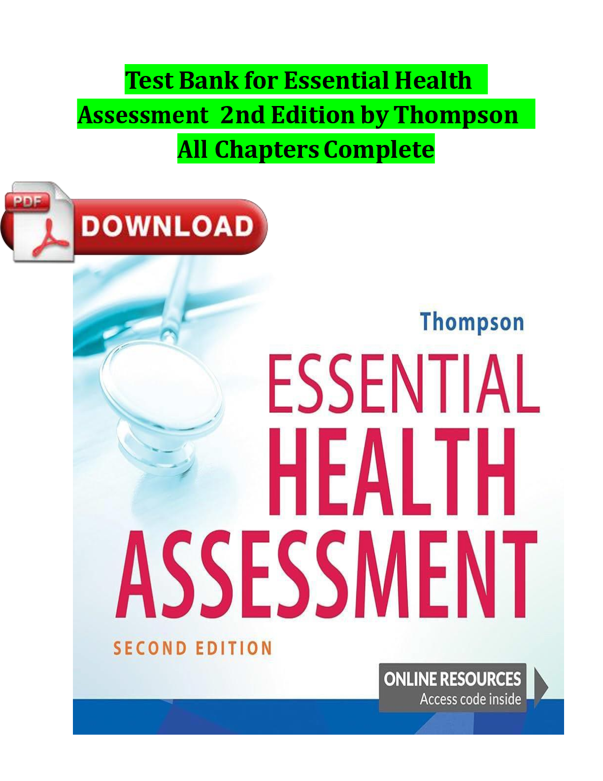 Physical Examination and Health Assessment, 8th Edition > TEST BANKS > Test Bank for Essential Health Assessment, 2nd Edition by Janice M. Thompson | ISBN: 9781719642323 | Complete Verified Chapters 1-24 | Q&A | Downloadable PDF
