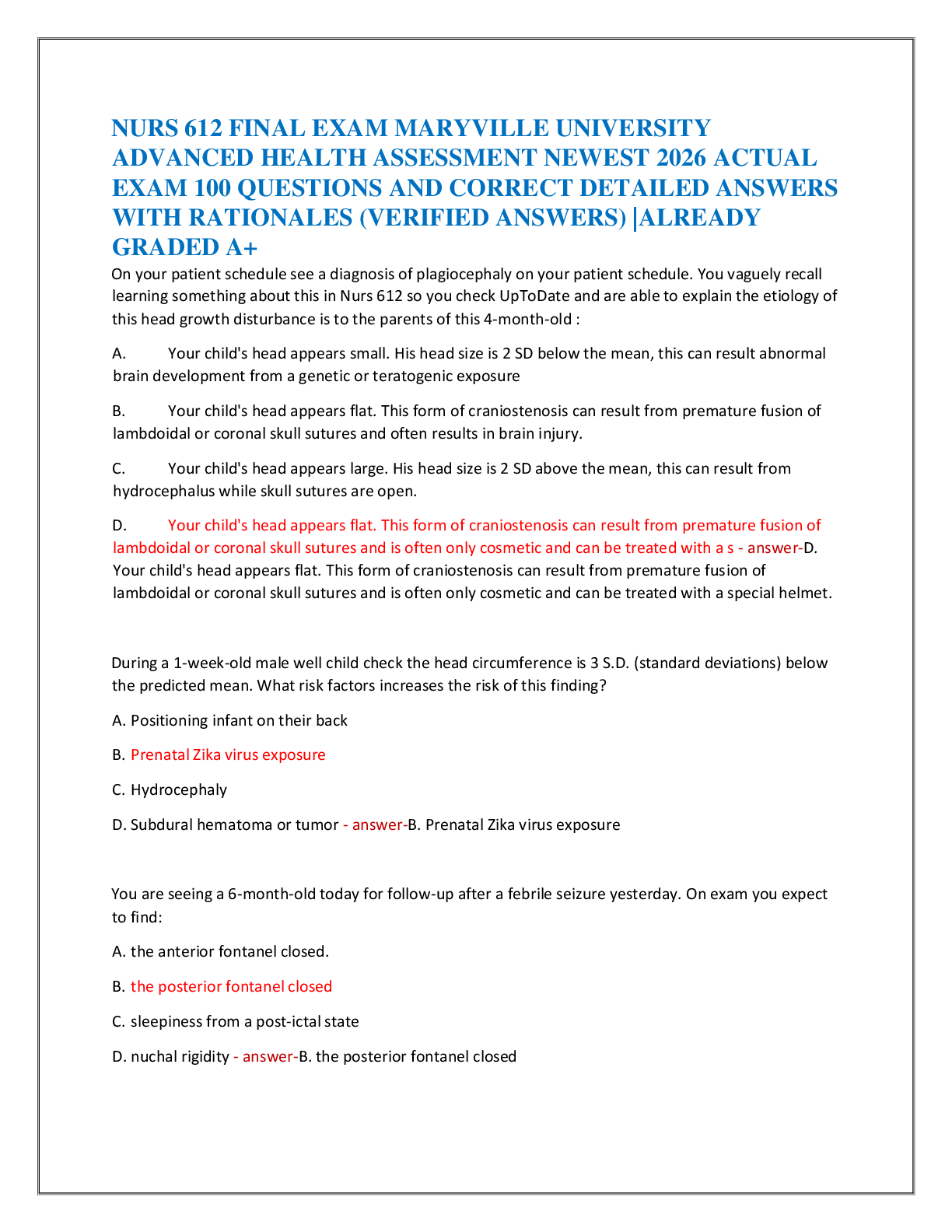 *NURSING > FINAL EXAM > NURS 612 FINAL EXAM MARYVILLE UNIVERSITY ADVANCED HEALTH ASSESSMENT NEWEST 2026 ACTUAL EXAM 100 QUESTIONS AND CORRECT DETAILED ANSWERS WITH RATIONALES (VERIFIED ANSWERS) |ALREADY GRADED A+