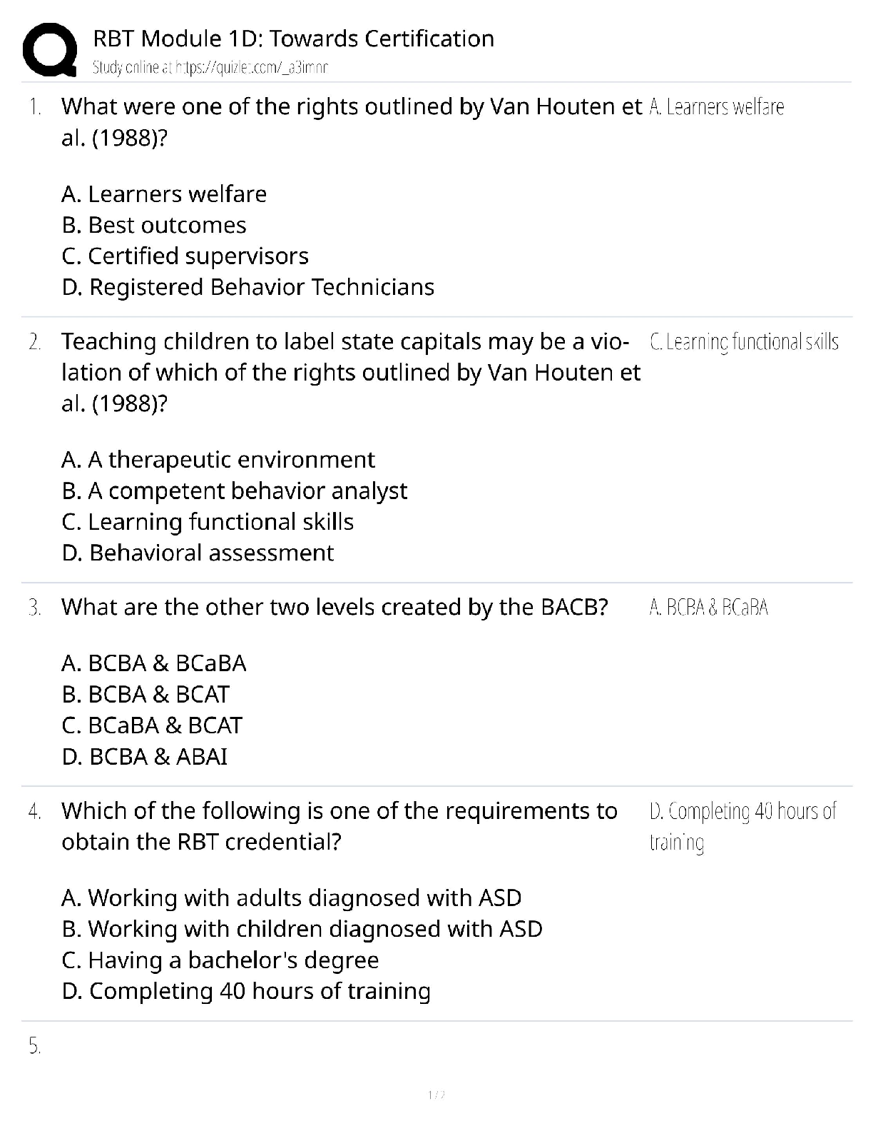 Business Management > QUESTIONS & ANSWERS > RBT Module 1D Towards Certification / 40-Hour Training Guide / 2025 Update / Score 100%