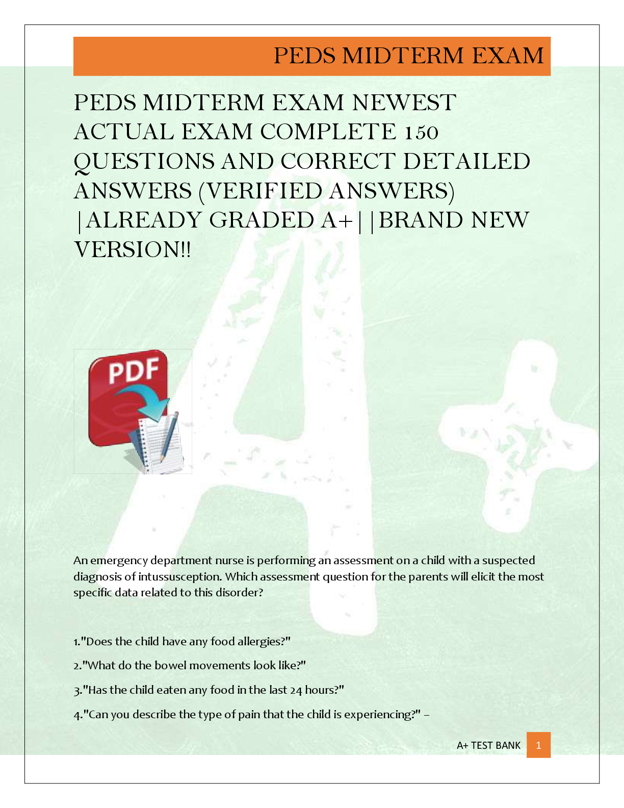 *NURSING > EXAM > PEDS MIDTERM EXAM NEWEST ACTUAL EXAM COMPLETE 150 QUESTIONS AND CORRECT DETAILED ANSWERS (VERIFIED ANSWERS) |ALREADY GRADED A+||BRAND NEW VERSION!!