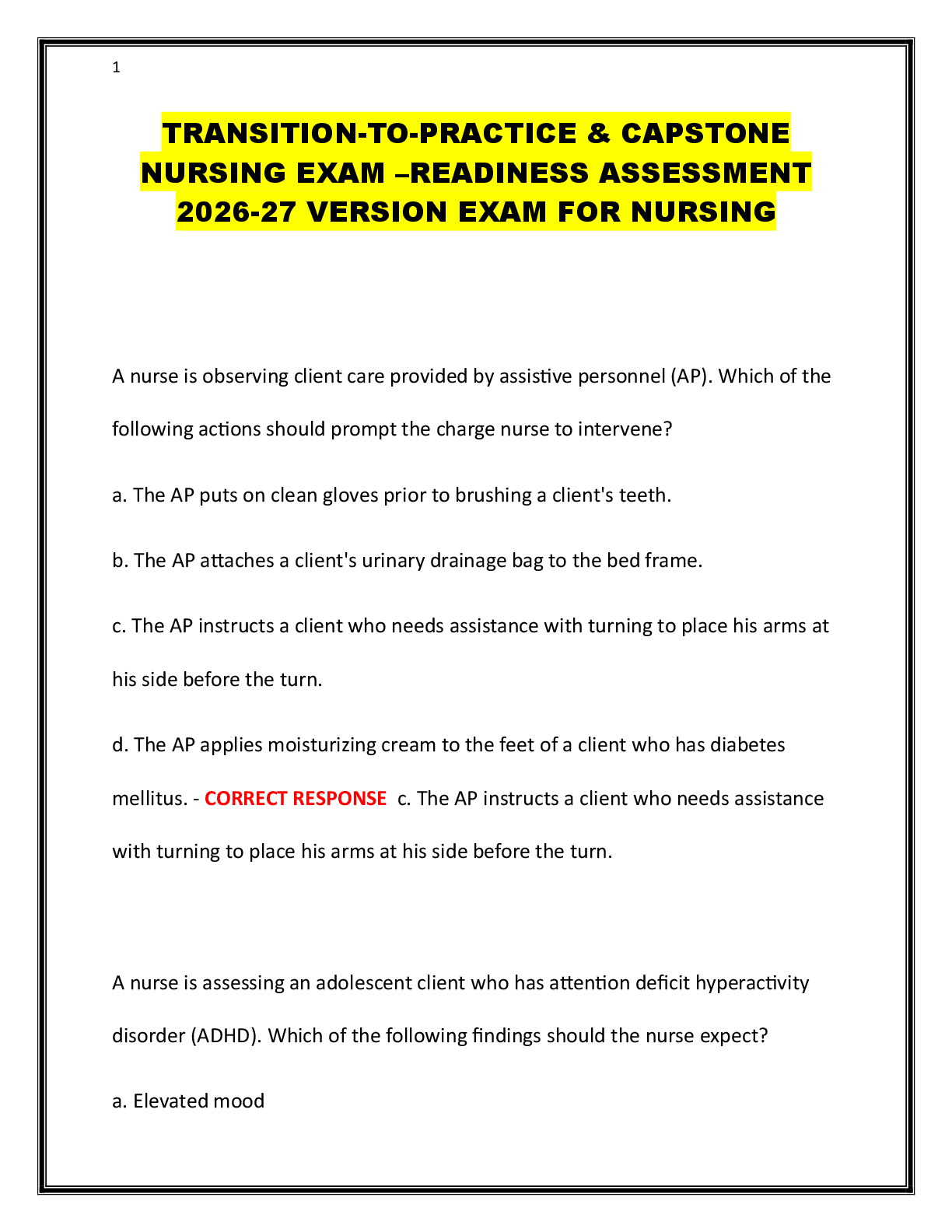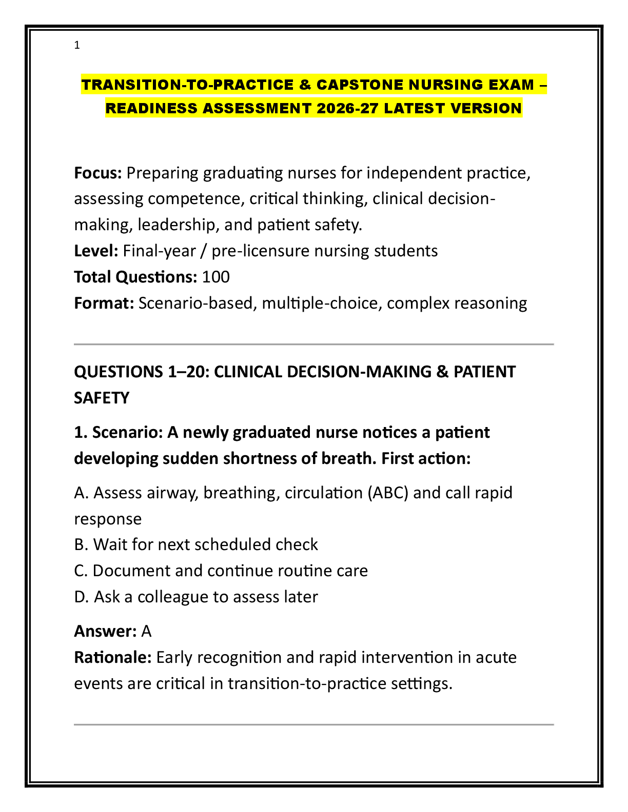 Capstone Exam > CAPSTONE > TRANSITION-TO-PRACTICE & CAPSTONE NURSING EXAM –READINESS ASSESSMENT 2026-27 VERSION EXAM FOR NURSING