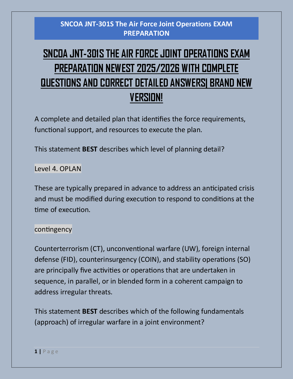 Law > EXAM > SNCOA JNT-301S THE AIR FORCE JOINT OPERATIONS EXAM PREPARATION NEWEST 2025/2026 WITH COMPLETE QUESTIONS AND CORRECT DETAILED ANSWERS| BRAND NEW VERSION!
