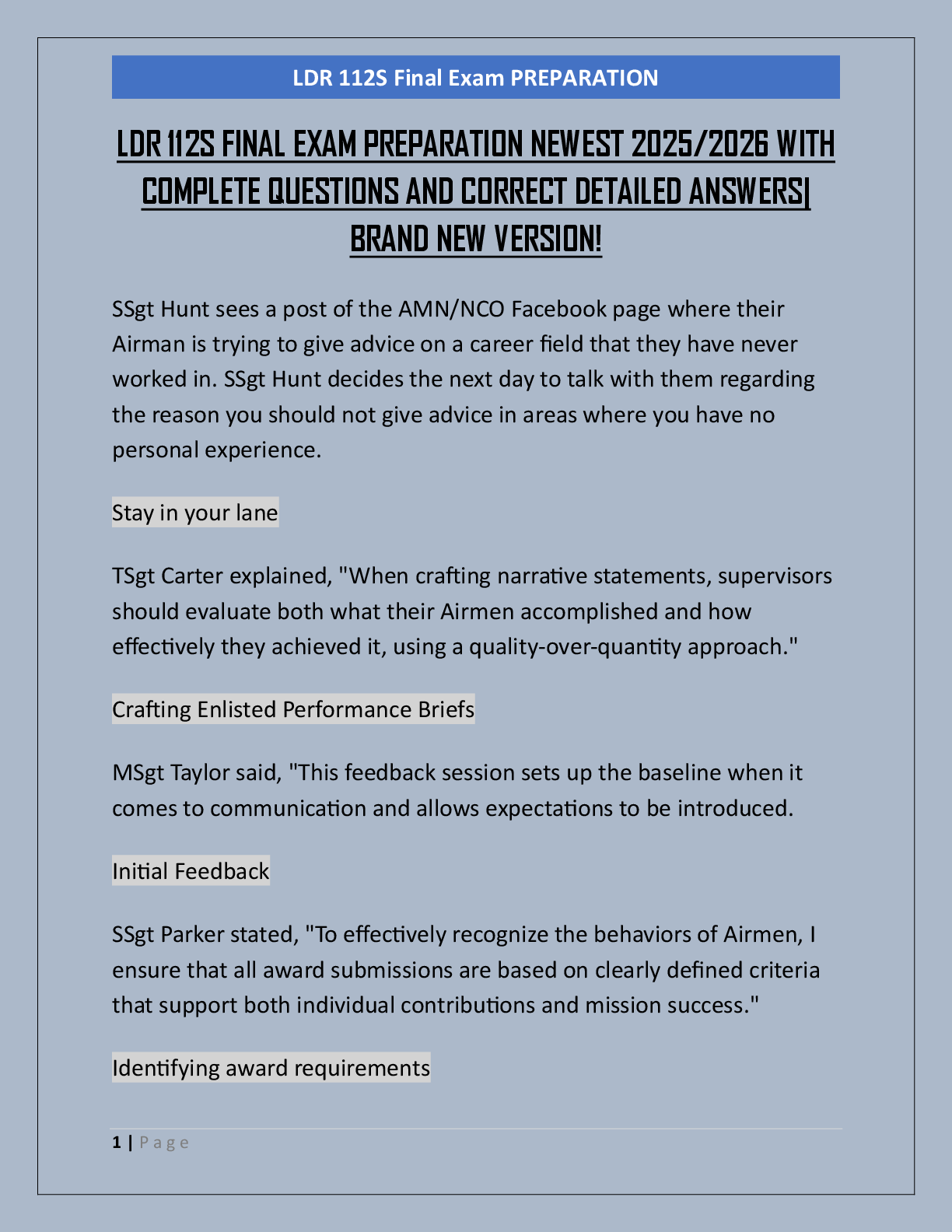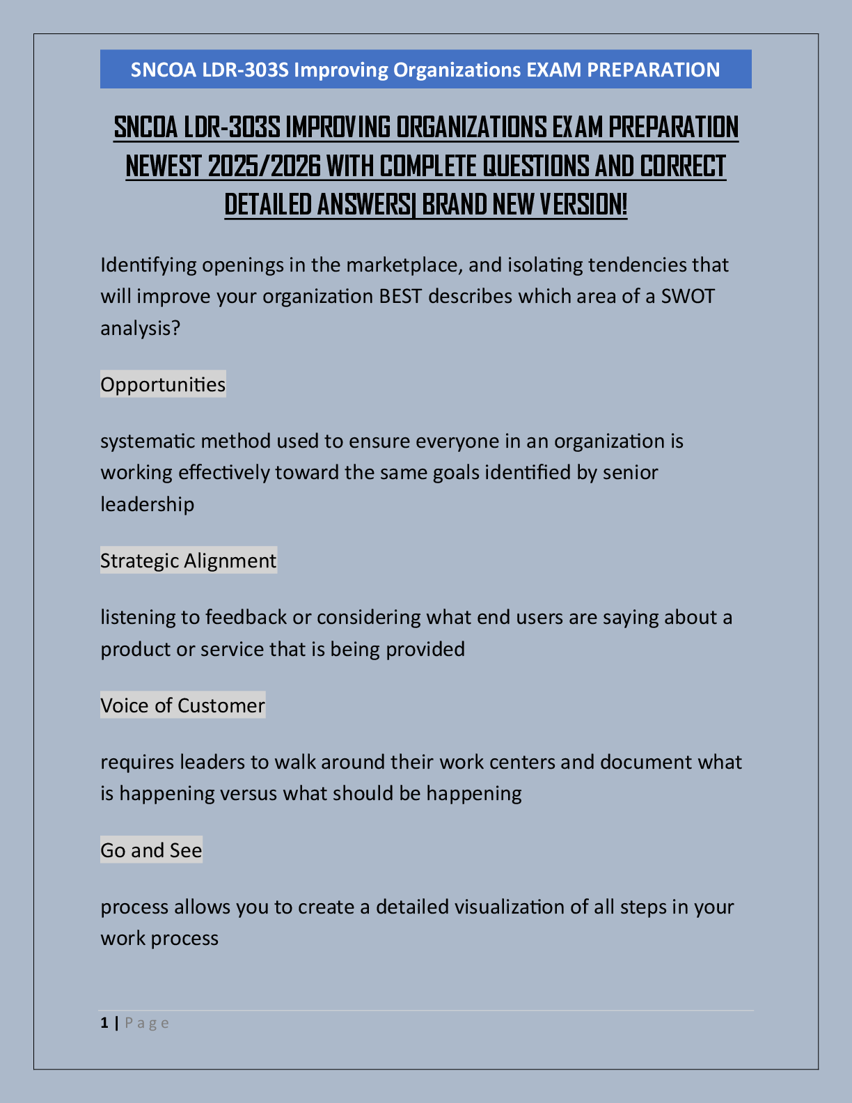Business Management > EXAM > SNCOA LDR-303S IMPROVING ORGANIZATIONS EXAM PREPARATION NEWEST 2025/2026 WITH COMPLETE QUESTIONS AND CORRECT DETAILED ANSWERS| BRAND NEW VERSION!