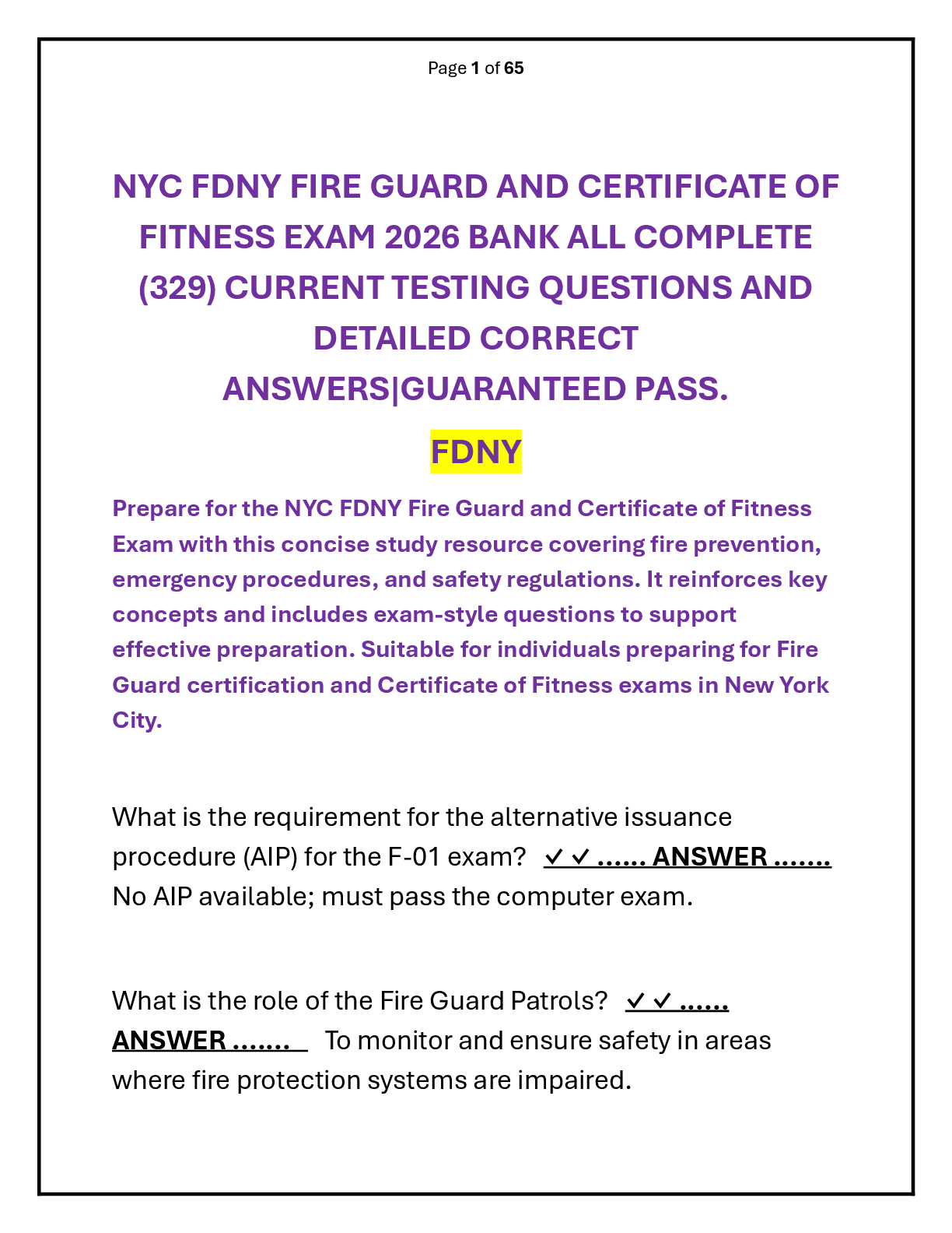 Fire Officer > QUESTIONS & ANSWERS > NYC FDNY FIRE GUARD AND CERTIFICATE OF FITNESS EXAM 2026 QUESTION AND ANSWER