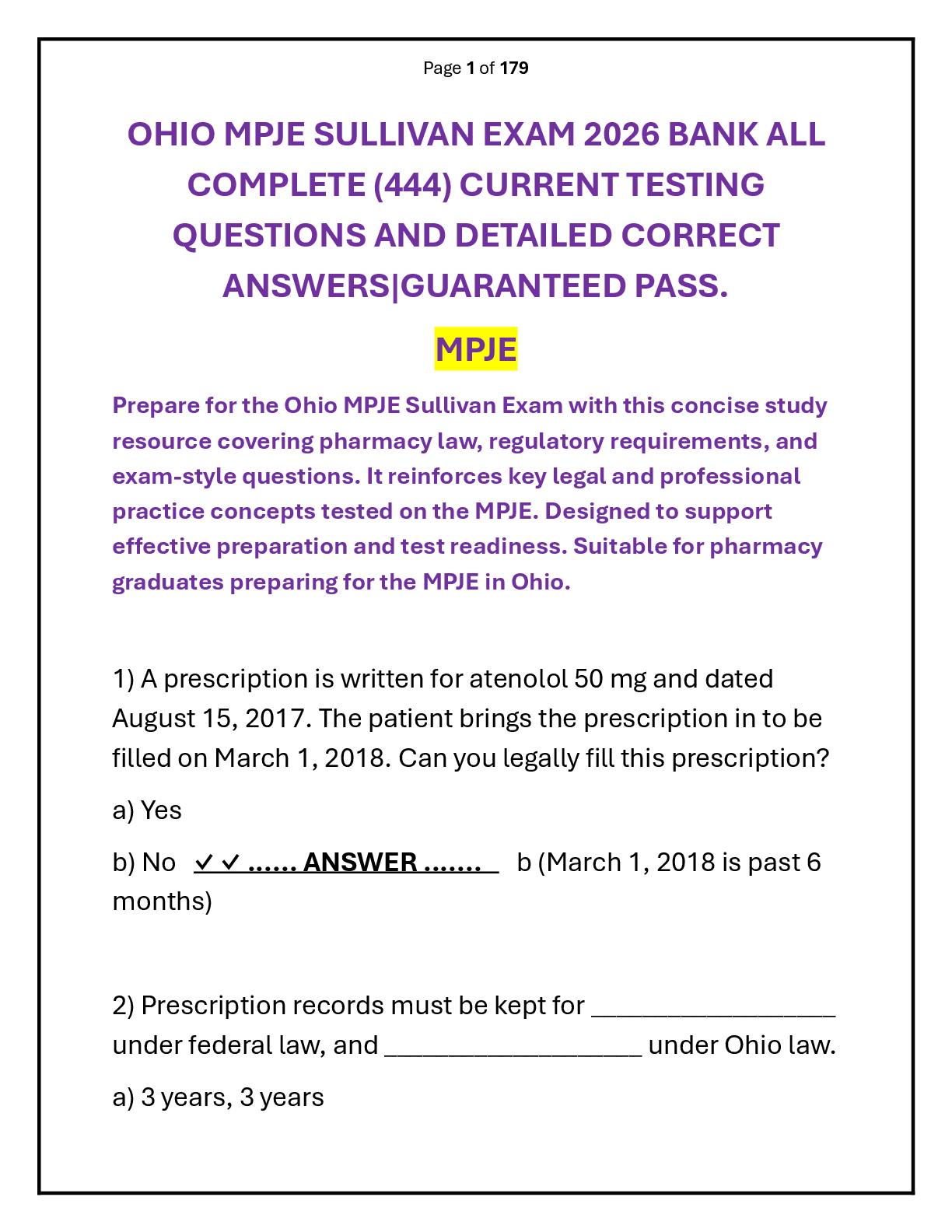 Pharmacology > QUESTIONS & ANSWERS > OHIO MPJE SULLIVAN EXAM 2026 QUESTION AND ANSWER
