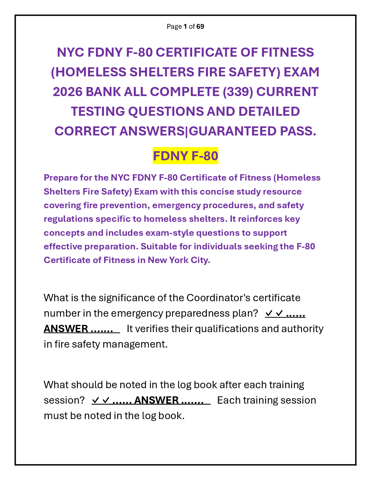 Fire Officer > QUESTIONS & ANSWERS > NYC FDNY F-80 CERTIFICATE OF FITNESS (HOMELESS SHELTERS FIRE SAFETY) EXAM 2026 QUESTION AND ANSWER