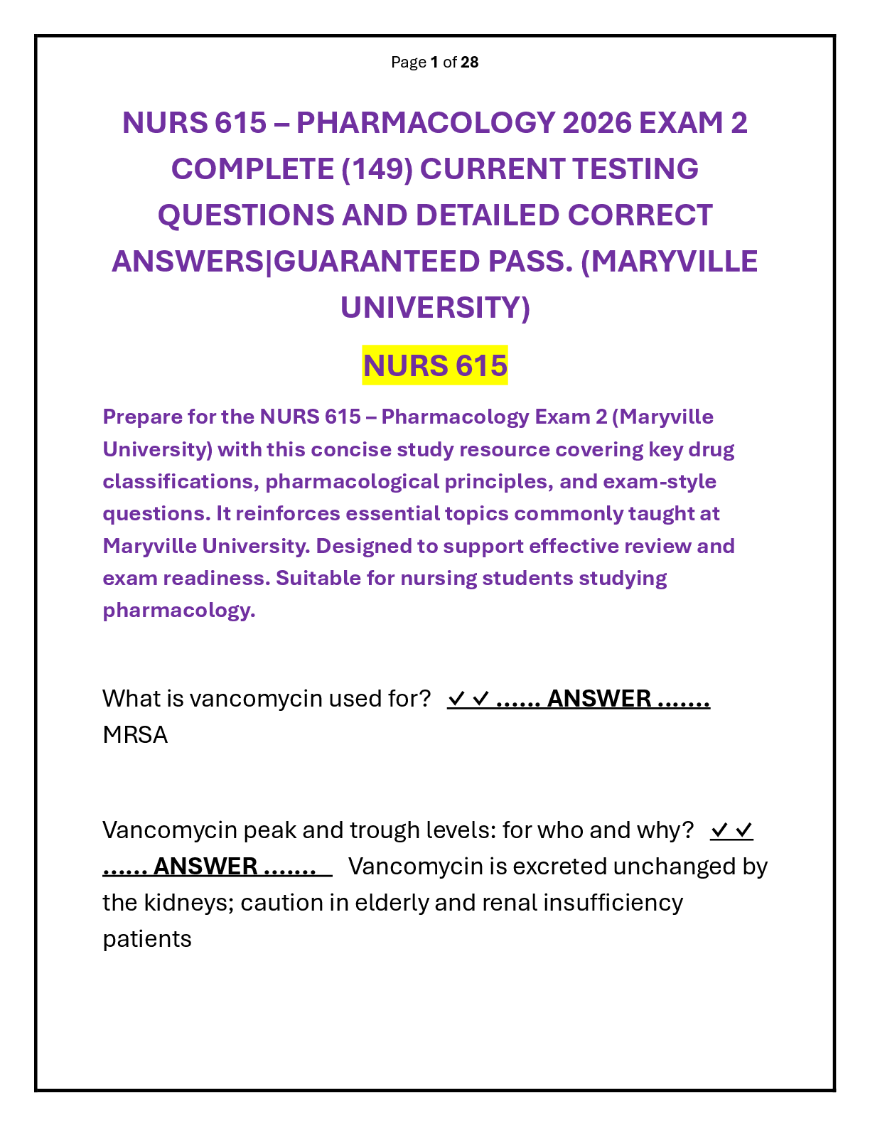 *NURSING > QUESTIONS & ANSWERS > NURS 615 – PHARMACOLOGY 2026 EXAM 2 QUESTION AND ANSWER