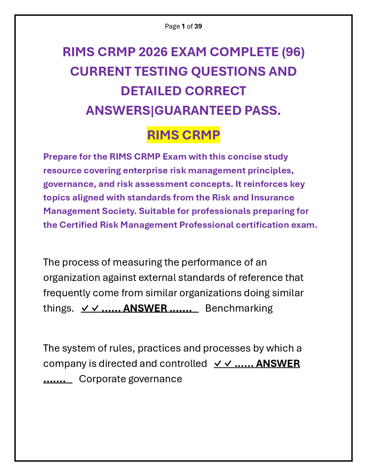 Risk Management and Insurance > QUESTIONS & ANSWERS > RIMS CRMP 2026 EXAM QUESTION AND ANSWER