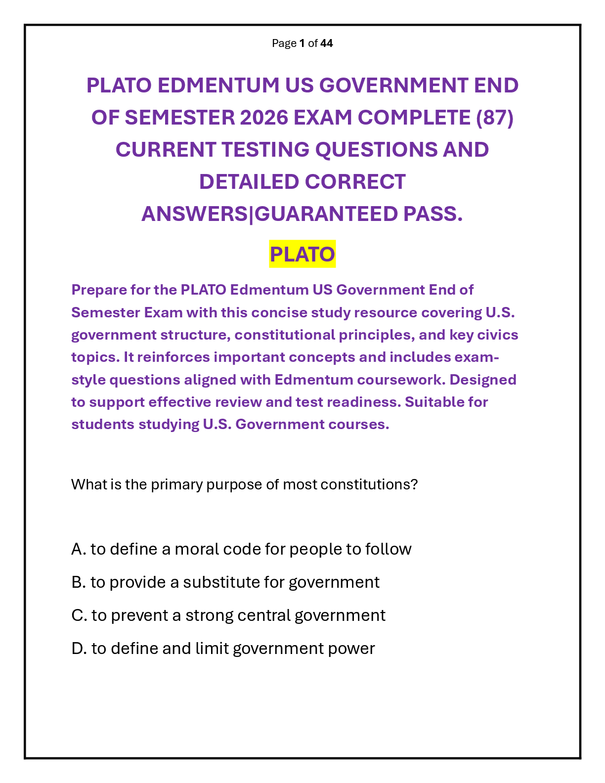 Law > QUESTIONS & ANSWERS > PLATO EDMENTUM US GOVERNMENT END OF SEMESTER 2026 EXAM QUESTION AND ANSWER