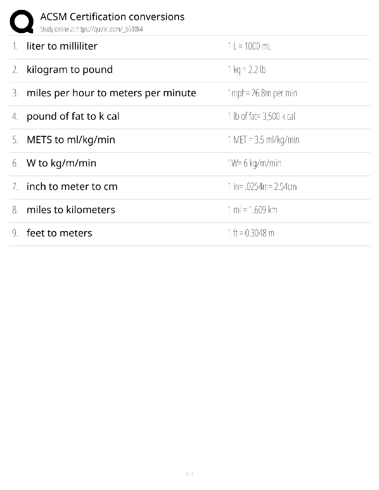 CERTIFIED FITNESS TRAINER > QUESTIONS & ANSWERS > ACSM Certification Conversions Test Bank / Exercise Science Calculations / 2025 Update / Score 100%