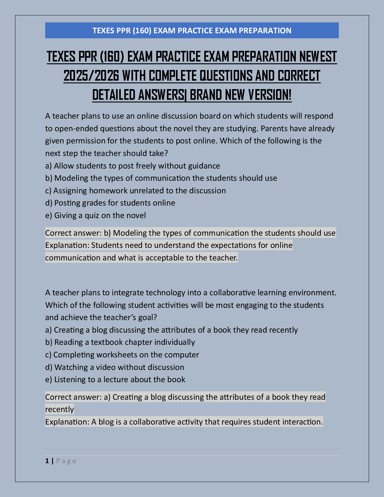 Clinical Psychology > EXAM > TEXES PPR (160) EXAM PRACTICE EXAM PREPARATION NEWEST 2025/2026 WITH COMPLETE QUESTIONS AND CORRECT DETAILED ANSWERS| BRAND NEW VERSION!
